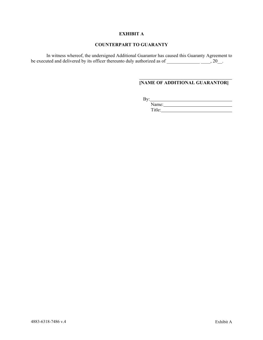 4883-6318-7486 v.4 Exhibit A EXHIBIT A COUNTERPART TO GUARANTY In witness whereof, the undersigned Additional Guarantor has caused this Guaranty Agreement to be executed and delivered by its officer thereunto duly authorized as of ______________ ____, 20__. [NAME OF ADDITIONAL GUARANTOR] By: Name: Title: