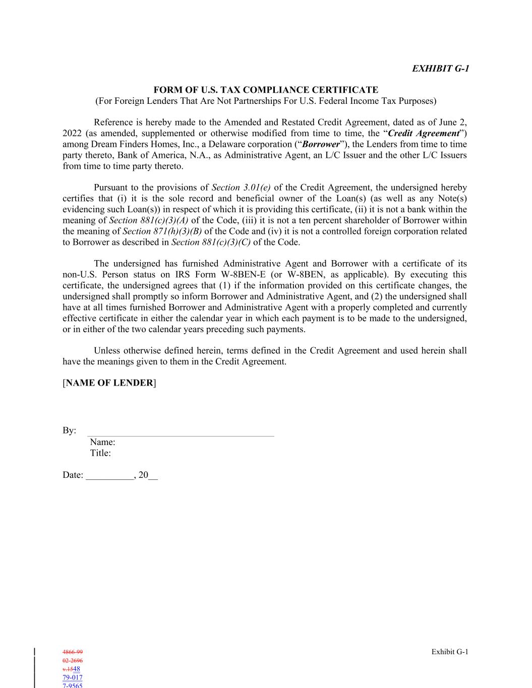 4866-99 02-2696 v.1548 79-017 7-9565 Exhibit G-1 By: Title: [NAME OF LENDER] Date: __________, 20__ Name: EXHIBIT G-1 FORM OF U.S. TAX COMPLIANCE CERTIFICATE (For Foreign Lenders That Are Not Partnerships For U.S. Federal Income Tax Purposes) Reference is hereby made to the Amended and Restated Credit Agreement, dated as of June 2, 2022 (as amended, supplemented or otherwise modified from time to time, the “Credit Agreement”) among Dream Finders Homes, Inc., a Delaware corporation (“Borrower”), the Lenders from time to time party thereto, Bank of America, N.A., as Administrative Agent, an L/C Issuer and the other L/C Issuers from time to time party thereto. Pursuant to the provisions of Section 3.01(e) of the Credit Agreement, the undersigned hereby certifies that (i) it is the sole record and beneficial owner of the Loan(s) (as well as any Note(s) evidencing such Loan(s)) in respect of which it is providing this certificate, (ii) it is not a bank within the meaning of Section 881(c)(3)(A) of the Code, (iii) it is not a ten percent shareholder of Borrower within the meaning of Section 871(h)(3)(B) of the Code and (iv) it is not a controlled foreign corporation related to Borrower as described in Section 881(c)(3)(C) of the Code. The undersigned has furnished Administrative Agent and Borrower with a certificate of its non-U.S. Person status on IRS Form W-8BEN-E (or W-8BEN, as applicable). By executing this certificate, the undersigned agrees that (1) if the information provided on this certificate changes, the undersigned shall promptly so inform Borrower and Administrative Agent, and (2) the undersigned shall have at all times furnished Borrower and Administrative Agent with a properly completed and currently effective certificate in either the calendar year in which each payment is to be made to the undersigned, or in either of the two calendar years preceding such payments. Unless otherwise defined herein, terms defined in the Credit Agreement and used herein shall have the meanings given to them in the Credit Agreement.