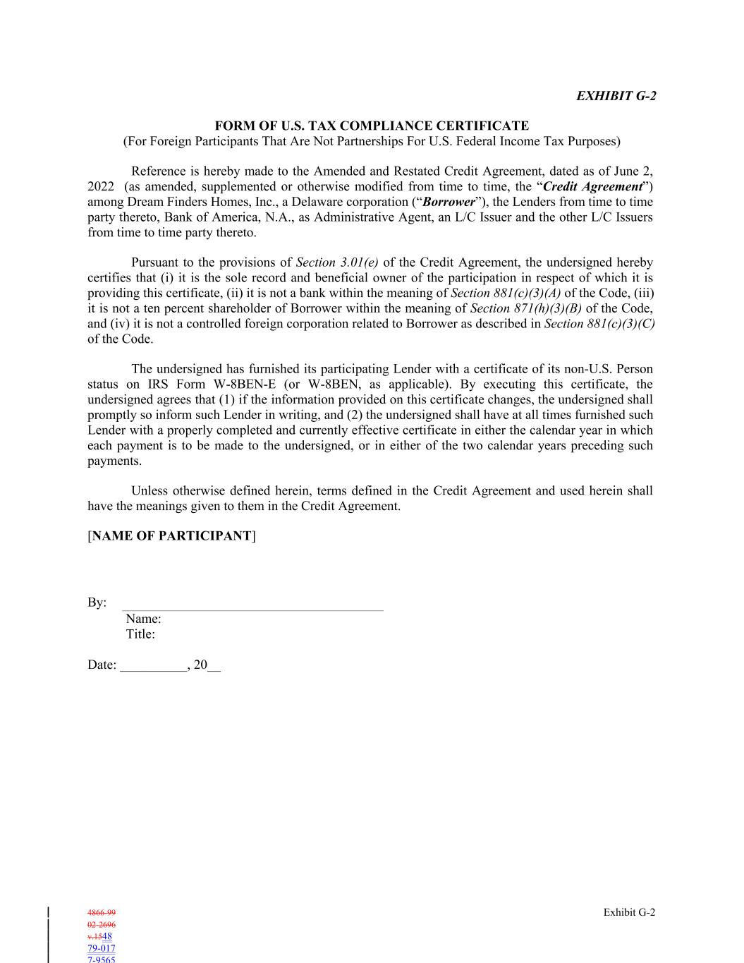 4866-99 02-2696 v.1548 79-017 7-9565 Exhibit G-2 By: Title: [NAME OF PARTICIPANT] Date: __________, 20__ Name: EXHIBIT G-2 FORM OF U.S. TAX COMPLIANCE CERTIFICATE (For Foreign Participants That Are Not Partnerships For U.S. Federal Income Tax Purposes) Reference is hereby made to the Amended and Restated Credit Agreement, dated as of June 2, 2022 (as amended, supplemented or otherwise modified from time to time, the “Credit Agreement”) among Dream Finders Homes, Inc., a Delaware corporation (“Borrower”), the Lenders from time to time party thereto, Bank of America, N.A., as Administrative Agent, an L/C Issuer and the other L/C Issuers from time to time party thereto. Pursuant to the provisions of Section 3.01(e) of the Credit Agreement, the undersigned hereby certifies that (i) it is the sole record and beneficial owner of the participation in respect of which it is providing this certificate, (ii) it is not a bank within the meaning of Section 881(c)(3)(A) of the Code, (iii) it is not a ten percent shareholder of Borrower within the meaning of Section 871(h)(3)(B) of the Code, and (iv) it is not a controlled foreign corporation related to Borrower as described in Section 881(c)(3)(C) of the Code. The undersigned has furnished its participating Lender with a certificate of its non-U.S. Person status on IRS Form W-8BEN-E (or W-8BEN, as applicable). By executing this certificate, the undersigned agrees that (1) if the information provided on this certificate changes, the undersigned shall promptly so inform such Lender in writing, and (2) the undersigned shall have at all times furnished such Lender with a properly completed and currently effective certificate in either the calendar year in which each payment is to be made to the undersigned, or in either of the two calendar years preceding such payments. Unless otherwise defined herein, terms defined in the Credit Agreement and used herein shall have the meanings given to them in the Credit Agreement.