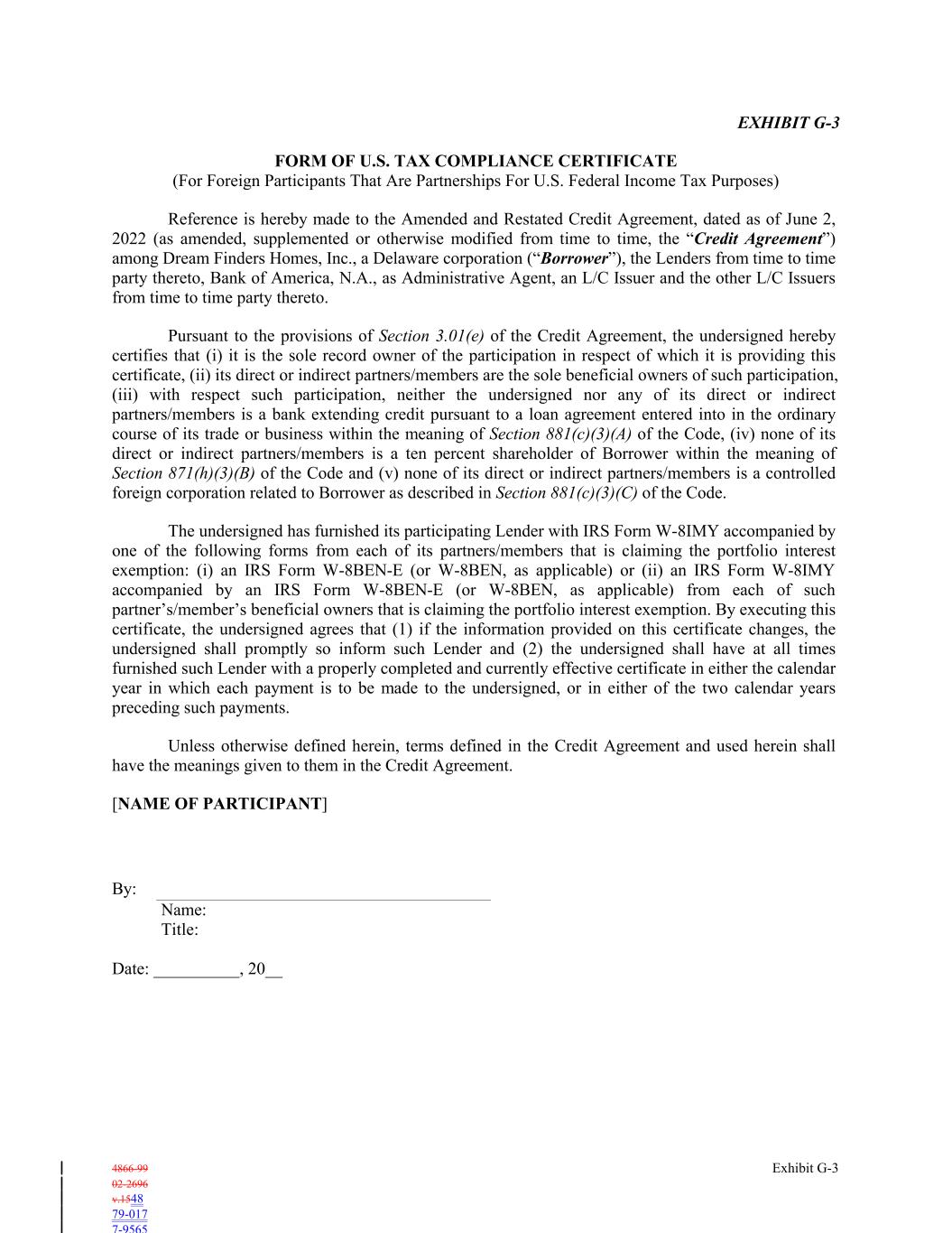 4866-99 02-2696 v.1548 79-017 7-9565 Exhibit G-3 By: Title: [NAME OF PARTICIPANT] Date: __________, 20__ Name: EXHIBIT G-3 FORM OF U.S. TAX COMPLIANCE CERTIFICATE (For Foreign Participants That Are Partnerships For U.S. Federal Income Tax Purposes) Reference is hereby made to the Amended and Restated Credit Agreement, dated as of June 2, 2022 (as amended, supplemented or otherwise modified from time to time, the “Credit Agreement”) among Dream Finders Homes, Inc., a Delaware corporation (“Borrower”), the Lenders from time to time party thereto, Bank of America, N.A., as Administrative Agent, an L/C Issuer and the other L/C Issuers from time to time party thereto. Pursuant to the provisions of Section 3.01(e) of the Credit Agreement, the undersigned hereby certifies that (i) it is the sole record owner of the participation in respect of which it is providing this certificate, (ii) its direct or indirect partners/members are the sole beneficial owners of such participation, (iii) with respect such participation, neither the undersigned nor any of its direct or indirect partners/members is a bank extending credit pursuant to a loan agreement entered into in the ordinary course of its trade or business within the meaning of Section 881(c)(3)(A) of the Code, (iv) none of its direct or indirect partners/members is a ten percent shareholder of Borrower within the meaning of Section 871(h)(3)(B) of the Code and (v) none of its direct or indirect partners/members is a controlled foreign corporation related to Borrower as described in Section 881(c)(3)(C) of the Code. The undersigned has furnished its participating Lender with IRS Form W-8IMY accompanied by one of the following forms from each of its partners/members that is claiming the portfolio interest exemption: (i) an IRS Form W-8BEN-E (or W-8BEN, as applicable) or (ii) an IRS Form W-8IMY accompanied by an IRS Form W-8BEN-E (or W-8BEN, as applicable) from each of such partner’s/member’s beneficial owners that is claiming the portfolio interest exemption. By executing this certificate, the undersigned agrees that (1) if the information provided on this certificate changes, the undersigned shall promptly so inform such Lender and (2) the undersigned shall have at all times furnished such Lender with a properly completed and currently effective certificate in either the calendar year in which each payment is to be made to the undersigned, or in either of the two calendar years preceding such payments. Unless otherwise defined herein, terms defined in the Credit Agreement and used herein shall have the meanings given to them in the Credit Agreement.