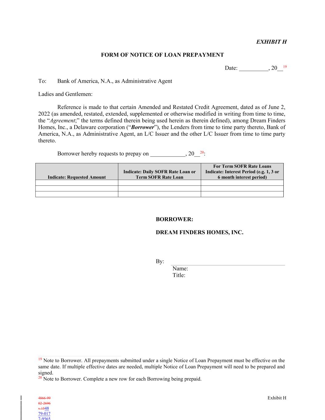 4866-99 02-2696 v.1548 79-017 7-9565 Exhibit H Indicate: Requested Amount BORROWER: DREAM FINDERS HOMES, INC. Indicate: Daily SOFR Rate Loan or Term SOFR Rate Loan By: EXHIBIT H FORM OF NOTICE OF LOAN PREPAYMENT For Term SOFR Rate Loans Indicate: Interest Period (e.g. 1, 3 or 6 month interest period) Name: Date: __________, 20__19 To: Bank of America, N.A., as Administrative Agent Ladies and Gentlemen: Reference is made to that certain Amended and Restated Credit Agreement, dated as of June 2, 2022 (as amended, restated, extended, supplemented or otherwise modified in writing from time to time, the “Agreement;” the terms defined therein being used herein as therein defined), among Dream Finders Homes, Inc., a Delaware corporation (“Borrower”), the Lenders from time to time party thereto, Bank of America, N.A., as Administrative Agent, an L/C Issuer and the other L/C Issuer from time to time party thereto. Title: Borrower hereby requests to prepay on ____________, 20__20: 19 Note to Borrower. All prepayments submitted under a single Notice of Loan Prepayment must be effective on the same date. If multiple effective dates are needed, multiple Notice of Loan Prepayment will need to be prepared and signed. 20 Note to Borrower. Complete a new row for each Borrowing being prepaid.