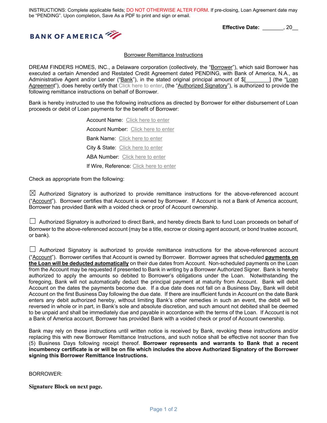 INSTRUCTIONS: Complete applicable fields; DO NOT OTHERWISE ALTER FORM. If pre-closing, Loan Agreement date may be “PENDING”. Upon completion, Save As a PDF to print and sign or email. Page 1 of 2 Effective Date: _______, 20__ Borrower Remittance Instructions DREAM FINDERS HOMES, INC., a Delaware corporation (collectively, the “Borrower”), which said Borrower has executed a certain Amended and Restated Credit Agreement dated PENDING, with Bank of America, N.A., as Administrative Agent and/or Lender (“Bank”), in the stated original principal amount of $[________] (the “Loan Agreement”), does hereby certify that Click here to enter, (the “Authorized Signatory”), is authorized to provide the following remittance instructions on behalf of Borrower. Bank is hereby instructed to use the following instructions as directed by Borrower for either disbursement of Loan proceeds or debit of Loan payments for the benefit of Borrower: Account Name: Click here to enter Account Number: Click here to enter Bank Name: Click here to enter City & State: Click here to enter ABA Number: Click here to enter If Wire, Reference: Click here to enter Check as appropriate from the following: ☒ Authorized Signatory is authorized to provide remittance instructions for the above-referenced account (“Account”). Borrower certifies that Account is owned by Borrower. If Account is not a Bank of America account, Borrower has provided Bank with a voided check or proof of Account ownership. ☐ Authorized Signatory is authorized to direct Bank, and hereby directs Bank to fund Loan proceeds on behalf of Borrower to the above-referenced account (may be a title, escrow or closing agent account, or bond trustee account, or bank). ☐ Authorized Signatory is authorized to provide remittance instructions for the above-referenced account (“Account”). Borrower certifies that Account is owned by Borrower. Borrower agrees that scheduled payments on the Loan will be deducted automatically on their due dates from Account. Non-scheduled payments on the Loan from the Account may be requested if presented to Bank in writing by a Borrower Authorized Signer. Bank is hereby authorized to apply the amounts so debited to Borrower’s obligations under the Loan. Notwithstanding the foregoing, Bank will not automatically deduct the principal payment at maturity from Account. Bank will debit Account on the dates the payments become due. If a due date does not fall on a Business Day, Bank will debit Account on the first Business Day following the due date. If there are insufficient funds in Account on the date Bank enters any debit authorized hereby, without limiting Bank’s other remedies in such an event, the debit will be reversed in whole or in part, in Bank’s sole and absolute discretion, and such amount not debited shall be deemed to be unpaid and shall be immediately due and payable in accordance with the terms of the Loan. If Account is not a Bank of America account, Borrower has provided Bank with a voided check or proof of Account ownership. Bank may rely on these instructions until written notice is received by Bank, revoking these instructions and/or replacing this with new Borrower Remittance Instructions, and such notice shall be effective not sooner than five (5) Business Days following receipt thereof. Borrower represents and warrants to Bank that a recent incumbency certificate is or will be on file which includes the above Authorized Signatory of the Borrower signing this Borrower Remittance Instructions. BORROWER: Signature Block on next page.
