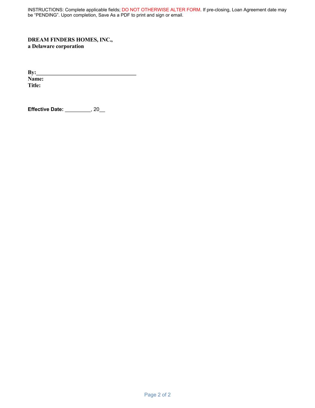 INSTRUCTIONS: Complete applicable fields; DO NOT OTHERWISE ALTER FORM. If pre-closing, Loan Agreement date may be “PENDING”. Upon completion, Save As a PDF to print and sign or email. Page 2 of 2 DREAM FINDERS HOMES, INC., a Delaware corporation By:____________________________________ Name: Title: Effective Date: _________, 20__