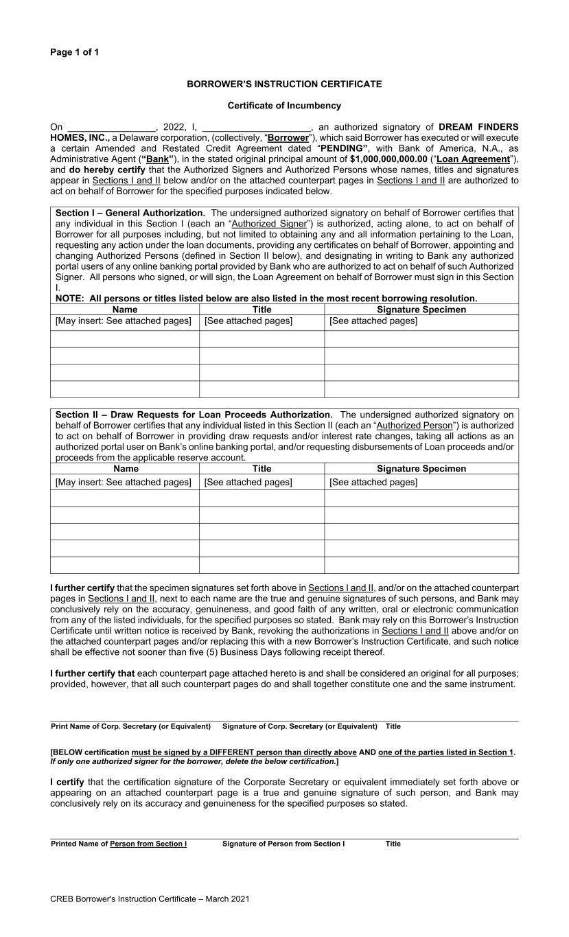 CREB Borrower's Instruction Certificate – March 2021 Page 1 of 1 BORROWER’S INSTRUCTION CERTIFICATE Certificate of Incumbency On _________________, 2022, I, _____________________, an authorized signatory of DREAM FINDERS HOMES, INC., a Delaware corporation, (collectively, “Borrower”), which said Borrower has executed or will execute a certain Amended and Restated Credit Agreement dated “PENDING”, with Bank of America, N.A., as Administrative Agent (“Bank”), in the stated original principal amount of $1,000,000,000.00 (“Loan Agreement”), and do hereby certify that the Authorized Signers and Authorized Persons whose names, titles and signatures appear in Sections I and II below and/or on the attached counterpart pages in Sections I and II are authorized to act on behalf of Borrower for the specified purposes indicated below. Section I – General Authorization. The undersigned authorized signatory on behalf of Borrower certifies that any individual in this Section I (each an “Authorized Signer”) is authorized, acting alone, to act on behalf of Borrower for all purposes including, but not limited to obtaining any and all information pertaining to the Loan, requesting any action under the loan documents, providing any certificates on behalf of Borrower, appointing and changing Authorized Persons (defined in Section II below), and designating in writing to Bank any authorized portal users of any online banking portal provided by Bank who are authorized to act on behalf of such Authorized Signer. All persons who signed, or will sign, the Loan Agreement on behalf of Borrower must sign in this Section I. NOTE: All persons or titles listed below are also listed in the most recent borrowing resolution. Name Title Signature Specimen [May insert: See attached pages] [See attached pages] [See attached pages] Section II – Draw Requests for Loan Proceeds Authorization. The undersigned authorized signatory on behalf of Borrower certifies that any individual listed in this Section II (each an “Authorized Person”) is authorized to act on behalf of Borrower in providing draw requests and/or interest rate changes, taking all actions as an authorized portal user on Bank’s online banking portal, and/or requesting disbursements of Loan proceeds and/or proceeds from the applicable reserve account. Name Title Signature Specimen [May insert: See attached pages] [See attached pages] [See attached pages] I further certify that the specimen signatures set forth above in Sections I and II, and/or on the attached counterpart pages in Sections I and II, next to each name are the true and genuine signatures of such persons, and Bank may conclusively rely on the accuracy, genuineness, and good faith of any written, oral or electronic communication from any of the listed individuals, for the specified purposes so stated. Bank may rely on this Borrower’s Instruction Certificate until written notice is received by Bank, revoking the authorizations in Sections I and II above and/or on the attached counterpart pages and/or replacing this with a new Borrower’s Instruction Certificate, and such notice shall be effective not sooner than five (5) Business Days following receipt thereof. I further certify that each counterpart page attached hereto is and shall be considered an original for all purposes; provided, however, that all such counterpart pages do and shall together constitute one and the same instrument. Print Name of Corp. Secretary (or Equivalent) Signature of Corp. Secretary (or Equivalent) Title [BELOW certification must be signed by a DIFFERENT person than directly above AND one of the parties listed in Section 1. If only one authorized signer for the borrower, delete the below certification.] I certify that the certification signature of the Corporate Secretary or equivalent immediately set forth above or appearing on an attached counterpart page is a true and genuine signature of such person, and Bank may conclusively rely on its accuracy and genuineness for the specified purposes so stated. Printed Name of Person from Section I Signature of Person from Section I Title