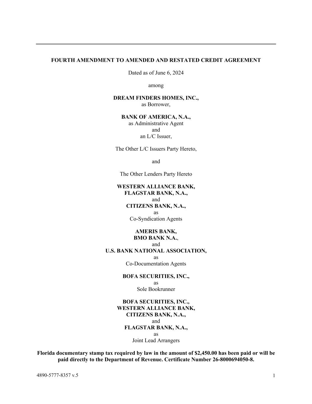 4890-5777-8357 v.5 1 FOURTH AMENDMENT TO AMENDED AND RESTATED CREDIT AGREEMENT Dated as of June 6, 2024 among DREAM FINDERS HOMES, INC., as Borrower, BANK OF AMERICA, N.A., as Administrative Agent and an L/C Issuer, The Other L/C Issuers Party Hereto, and The Other Lenders Party Hereto WESTERN ALLIANCE BANK, FLAGSTAR BANK, N.A., and CITIZENS BANK, N.A., as Co-Syndication Agents AMERIS BANK, BMO BANK N.A., and U.S. BANK NATIONAL ASSOCIATION, as Co-Documentation Agents BOFA SECURITIES, INC., as Sole Bookrunner BOFA SECURITIES, INC., WESTERN ALLIANCE BANK, CITIZENS BANK, N.A., and FLAGSTAR BANK, N.A., as Joint Lead Arrangers Florida documentary stamp tax required by law in the amount of $2,450.00 has been paid or will be paid directly to the Department of Revenue. Certificate Number 26-8000694050-8.