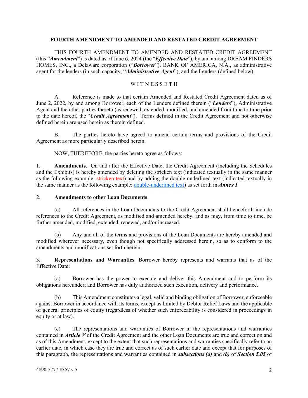 4890-5777-8357 v.5 2 FOURTH AMENDMENT TO AMENDED AND RESTATED CREDIT AGREEMENT THIS FOURTH AMENDMENT TO AMENDED AND RESTATED CREDIT AGREEMENT (this “Amendment”) is dated as of June 6, 2024 (the “Effective Date”), by and among DREAM FINDERS HOMES, INC., a Delaware corporation (“Borrower”), BANK OF AMERICA, N.A., as administrative agent for the lenders (in such capacity, “Administrative Agent”), and the Lenders (defined below). W I T N E S S E T H A. Reference is made to that certain Amended and Restated Credit Agreement dated as of June 2, 2022, by and among Borrower, each of the Lenders defined therein (“Lenders”), Administrative Agent and the other parties thereto (as renewed, extended, modified, and amended from time to time prior to the date hereof, the “Credit Agreement”). Terms defined in the Credit Agreement and not otherwise defined herein are used herein as therein defined. B. The parties hereto have agreed to amend certain terms and provisions of the Credit Agreement as more particularly described herein. NOW, THEREFORE, the parties hereto agree as follows: 1. Amendments. On and after the Effective Date, the Credit Agreement (including the Schedules and the Exhibits) is hereby amended by deleting the stricken text (indicated textually in the same manner as the following example: stricken text) and by adding the double-underlined text (indicated textually in the same manner as the following example: double-underlined text) as set forth in Annex I. 2. Amendments to other Loan Documents. (a) All references in the Loan Documents to the Credit Agreement shall henceforth include references to the Credit Agreement, as modified and amended hereby, and as may, from time to time, be further amended, modified, extended, renewed, and/or increased. (b) Any and all of the terms and provisions of the Loan Documents are hereby amended and modified wherever necessary, even though not specifically addressed herein, so as to conform to the amendments and modifications set forth herein. 3. Representations and Warranties. Borrower hereby represents and warrants that as of the Effective Date: (a) Borrower has the power to execute and deliver this Amendment and to perform its obligations hereunder; and Borrower has duly authorized such execution, delivery and performance. (b) This Amendment constitutes a legal, valid and binding obligation of Borrower, enforceable against Borrower in accordance with its terms, except as limited by Debtor Relief Laws and the applicable of general principles of equity (regardless of whether such enforceability is considered in proceedings in equity or at law). (c) The representations and warranties of Borrower in the representations and warranties contained in Article V of the Credit Agreement and the other Loan Documents are true and correct on and as of this Amendment, except to the extent that such representations and warranties specifically refer to an earlier date, in which case they are true and correct as of such earlier date and except that for purposes of this paragraph, the representations and warranties contained in subsections (a) and (b) of Section 5.05 of