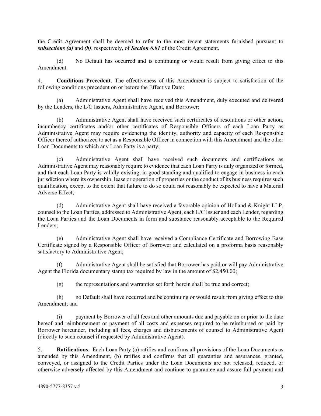 4890-5777-8357 v.5 3 the Credit Agreement shall be deemed to refer to the most recent statements furnished pursuant to subsections (a) and (b), respectively, of Section 6.01 of the Credit Agreement. (d) No Default has occurred and is continuing or would result from giving effect to this Amendment. 4. Conditions Precedent. The effectiveness of this Amendment is subject to satisfaction of the following conditions precedent on or before the Effective Date: (a) Administrative Agent shall have received this Amendment, duly executed and delivered by the Lenders, the L/C Issuers, Administrative Agent, and Borrower; (b) Administrative Agent shall have received such certificates of resolutions or other action, incumbency certificates and/or other certificates of Responsible Officers of each Loan Party as Administrative Agent may require evidencing the identity, authority and capacity of each Responsible Officer thereof authorized to act as a Responsible Officer in connection with this Amendment and the other Loan Documents to which any Loan Party is a party; (c) Administrative Agent shall have received such documents and certifications as Administrative Agent may reasonably require to evidence that each Loan Party is duly organized or formed, and that each Loan Party is validly existing, in good standing and qualified to engage in business in each jurisdiction where its ownership, lease or operation of properties or the conduct of its business requires such qualification, except to the extent that failure to do so could not reasonably be expected to have a Material Adverse Effect; (d) Administrative Agent shall have received a favorable opinion of Holland & Knight LLP, counsel to the Loan Parties, addressed to Administrative Agent, each L/C Issuer and each Lender, regarding the Loan Parties and the Loan Documents in form and substance reasonably acceptable to the Required Lenders; (e) Administrative Agent shall have received a Compliance Certificate and Borrowing Base Certificate signed by a Responsible Officer of Borrower and calculated on a proforma basis reasonably satisfactory to Administrative Agent; (f) Administrative Agent shall be satisfied that Borrower has paid or will pay Administrative Agent the Florida documentary stamp tax required by law in the amount of $2,450.00; (g) the representations and warranties set forth herein shall be true and correct; (h) no Default shall have occurred and be continuing or would result from giving effect to this Amendment; and (i) payment by Borrower of all fees and other amounts due and payable on or prior to the date hereof and reimbursement or payment of all costs and expenses required to be reimbursed or paid by Borrower hereunder, including all fees, charges and disbursements of counsel to Administrative Agent (directly to such counsel if requested by Administrative Agent). 5. Ratifications. Each Loan Party (a) ratifies and confirms all provisions of the Loan Documents as amended by this Amendment, (b) ratifies and confirms that all guaranties and assurances, granted, conveyed, or assigned to the Credit Parties under the Loan Documents are not released, reduced, or otherwise adversely affected by this Amendment and continue to guarantee and assure full payment and