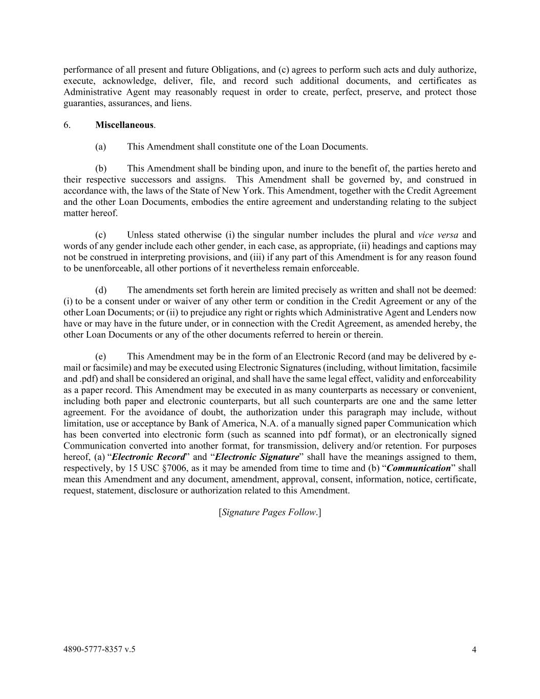 4890-5777-8357 v.5 4 performance of all present and future Obligations, and (c) agrees to perform such acts and duly authorize, execute, acknowledge, deliver, file, and record such additional documents, and certificates as Administrative Agent may reasonably request in order to create, perfect, preserve, and protect those guaranties, assurances, and liens. 6. Miscellaneous. (a) This Amendment shall constitute one of the Loan Documents. (b) This Amendment shall be binding upon, and inure to the benefit of, the parties hereto and their respective successors and assigns. This Amendment shall be governed by, and construed in accordance with, the laws of the State of New York. This Amendment, together with the Credit Agreement and the other Loan Documents, embodies the entire agreement and understanding relating to the subject matter hereof. (c) Unless stated otherwise (i) the singular number includes the plural and vice versa and words of any gender include each other gender, in each case, as appropriate, (ii) headings and captions may not be construed in interpreting provisions, and (iii) if any part of this Amendment is for any reason found to be unenforceable, all other portions of it nevertheless remain enforceable. (d) The amendments set forth herein are limited precisely as written and shall not be deemed: (i) to be a consent under or waiver of any other term or condition in the Credit Agreement or any of the other Loan Documents; or (ii) to prejudice any right or rights which Administrative Agent and Lenders now have or may have in the future under, or in connection with the Credit Agreement, as amended hereby, the other Loan Documents or any of the other documents referred to herein or therein. (e) This Amendment may be in the form of an Electronic Record (and may be delivered by e- mail or facsimile) and may be executed using Electronic Signatures (including, without limitation, facsimile and .pdf) and shall be considered an original, and shall have the same legal effect, validity and enforceability as a paper record. This Amendment may be executed in as many counterparts as necessary or convenient, including both paper and electronic counterparts, but all such counterparts are one and the same letter agreement. For the avoidance of doubt, the authorization under this paragraph may include, without limitation, use or acceptance by Bank of America, N.A. of a manually signed paper Communication which has been converted into electronic form (such as scanned into pdf format), or an electronically signed Communication converted into another format, for transmission, delivery and/or retention. For purposes hereof, (a) “Electronic Record” and “Electronic Signature” shall have the meanings assigned to them, respectively, by 15 USC §7006, as it may be amended from time to time and (b) “Communication” shall mean this Amendment and any document, amendment, approval, consent, information, notice, certificate, request, statement, disclosure or authorization related to this Amendment. [Signature Pages Follow.]