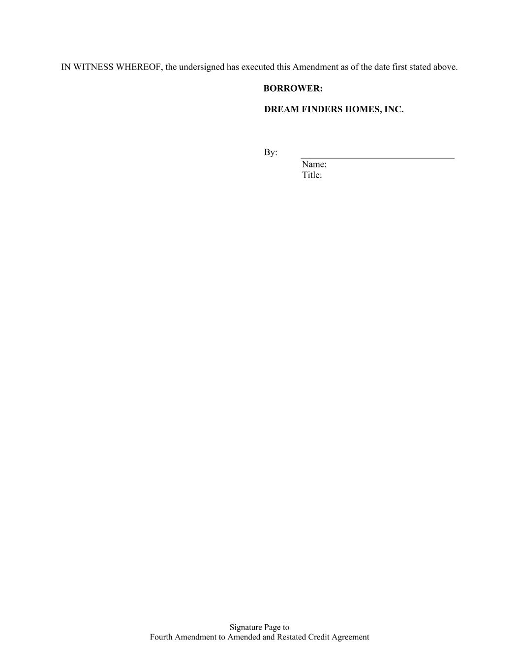 Signature Page to Fourth Amendment to Amended and Restated Credit Agreement IN WITNESS WHEREOF, the undersigned has executed this Amendment as of the date first stated above. BORROWER: DREAM FINDERS HOMES, INC. By: Name: Title: