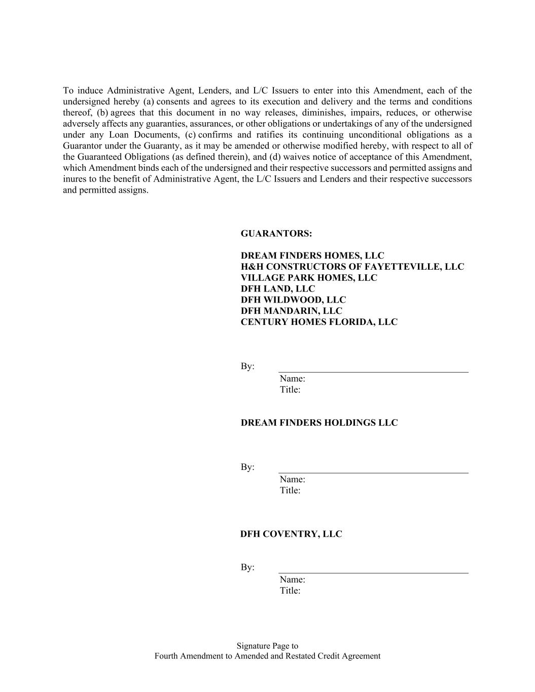 Signature Page to Fourth Amendment to Amended and Restated Credit Agreement To induce Administrative Agent, Lenders, and L/C Issuers to enter into this Amendment, each of the undersigned hereby (a) consents and agrees to its execution and delivery and the terms and conditions thereof, (b) agrees that this document in no way releases, diminishes, impairs, reduces, or otherwise adversely affects any guaranties, assurances, or other obligations or undertakings of any of the undersigned under any Loan Documents, (c) confirms and ratifies its continuing unconditional obligations as a Guarantor under the Guaranty, as it may be amended or otherwise modified hereby, with respect to all of the Guaranteed Obligations (as defined therein), and (d) waives notice of acceptance of this Amendment, which Amendment binds each of the undersigned and their respective successors and permitted assigns and inures to the benefit of Administrative Agent, the L/C Issuers and Lenders and their respective successors and permitted assigns. GUARANTORS: DREAM FINDERS HOMES, LLC H&H CONSTRUCTORS OF FAYETTEVILLE, LLC VILLAGE PARK HOMES, LLC DFH LAND, LLC DFH WILDWOOD, LLC DFH MANDARIN, LLC CENTURY HOMES FLORIDA, LLC By: Name: Title: DREAM FINDERS HOLDINGS LLC By: Name: Title: DFH COVENTRY, LLC By: Name: Title: