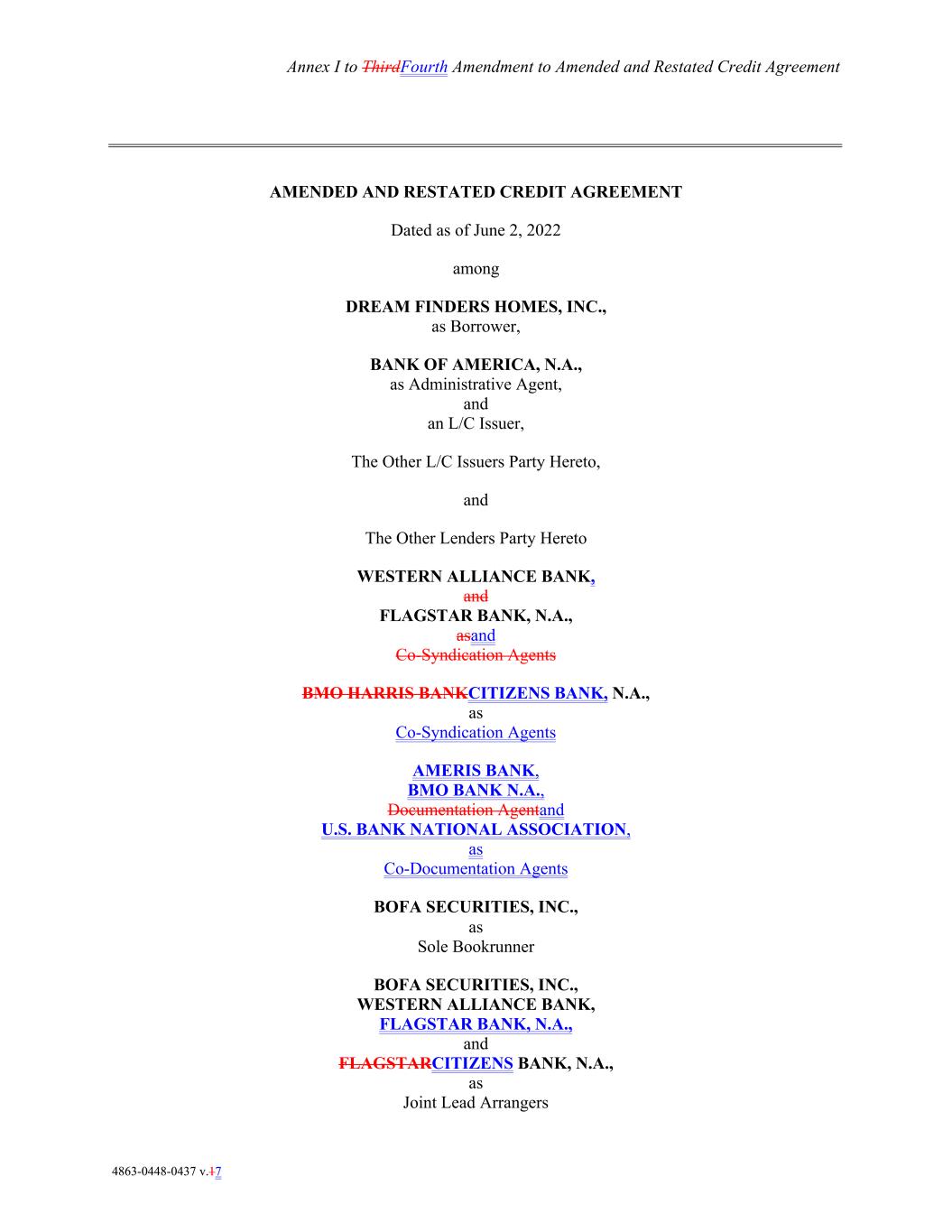 4863-0448-0437 v.17 Annex I to ThirdFourth Amendment to Amended and Restated Credit Agreement AMENDED AND RESTATED CREDIT AGREEMENT Dated as of June 2, 2022 among DREAM FINDERS HOMES, INC., as Borrower, BANK OF AMERICA, N.A., as Administrative Agent, and an L/C Issuer, The Other L/C Issuers Party Hereto, and The Other Lenders Party Hereto WESTERN ALLIANCE BANK, and FLAGSTAR BANK, N.A., asand Co-Syndication Agents BMO HARRIS BANKCITIZENS BANK, N.A., as Co-Syndication Agents AMERIS BANK, BMO BANK N.A., Documentation Agentand U.S. BANK NATIONAL ASSOCIATION, as Co-Documentation Agents BOFA SECURITIES, INC., as Sole Bookrunner BOFA SECURITIES, INC., WESTERN ALLIANCE BANK, FLAGSTAR BANK, N.A., and FLAGSTARCITIZENS BANK, N.A., as Joint Lead Arrangers