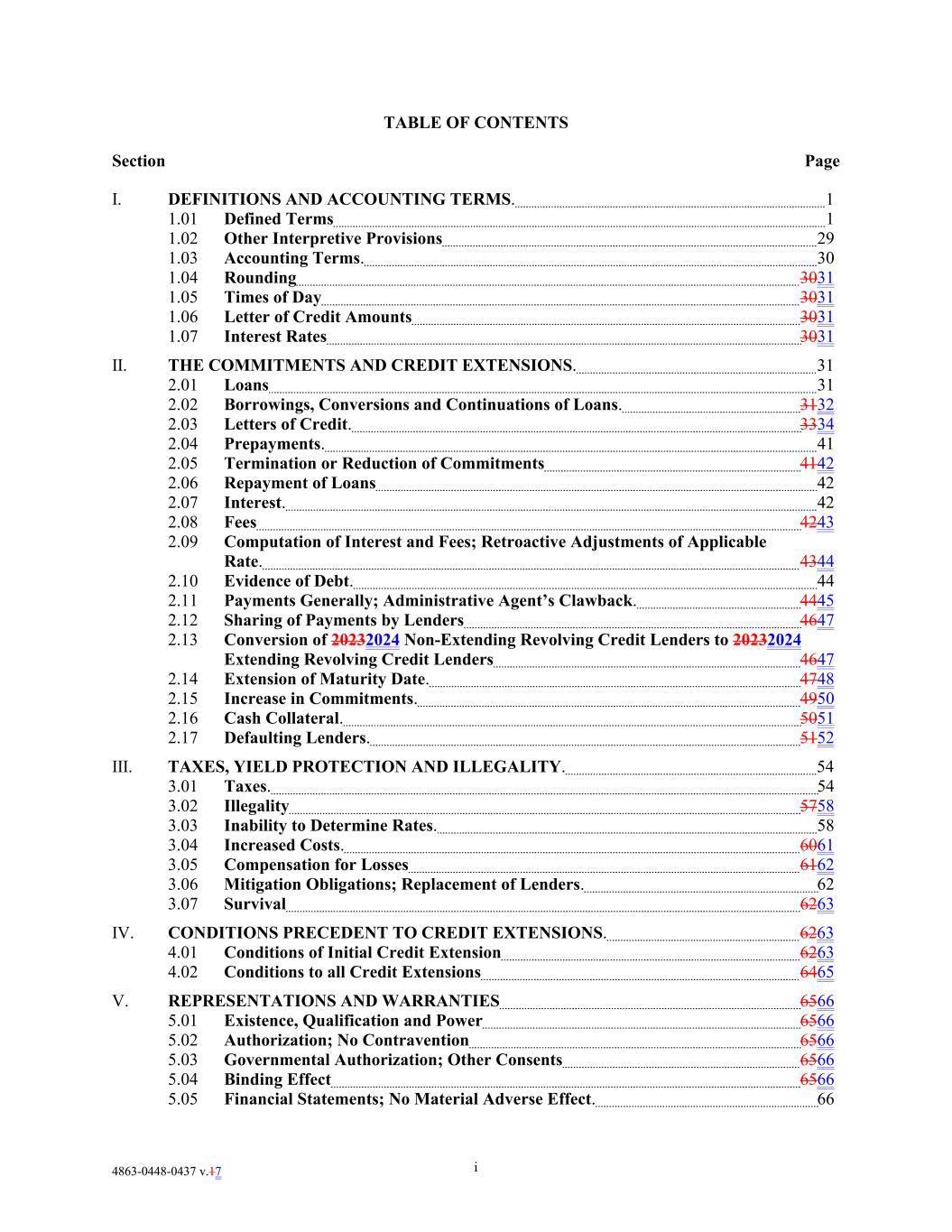 4863-0448-0437 v.17 i TABLE OF CONTENTS Section Page I. DEFINITIONS AND ACCOUNTING TERMS. 1 1.01 Defined Terms 1 1.02 Other Interpretive Provisions 29 1.03 Accounting Terms. 30 1.04 Rounding 3031 1.05 Times of Day 3031 1.06 Letter of Credit Amounts 3031 1.07 Interest Rates 3031 II. THE COMMITMENTS AND CREDIT EXTENSIONS. 31 2.01 Loans 31 2.02 Borrowings, Conversions and Continuations of Loans. 3132 2.03 Letters of Credit. 3334 2.04 Prepayments. 41 2.05 Termination or Reduction of Commitments 4142 2.06 Repayment of Loans 42 2.07 Interest. 42 2.08 Fees 4243 2.09 Computation of Interest and Fees; Retroactive Adjustments of Applicable Rate. 4344 2.10 Evidence of Debt. 44 2.11 Payments Generally; Administrative Agent’s Clawback. 4445 2.12 Sharing of Payments by Lenders 4647 2.13 Conversion of 20232024 Non-Extending Revolving Credit Lenders to 20232024 Extending Revolving Credit Lenders 4647 2.14 Extension of Maturity Date. 4748 2.15 Increase in Commitments. 4950 2.16 Cash Collateral. 5051 2.17 Defaulting Lenders. 5152 III. TAXES, YIELD PROTECTION AND ILLEGALITY. 54 3.01 Taxes. 54 3.02 Illegality 5758 3.03 Inability to Determine Rates. 58 3.04 Increased Costs. 6061 3.05 Compensation for Losses 6162 3.06 Mitigation Obligations; Replacement of Lenders. 62 3.07 Survival 6263 IV. CONDITIONS PRECEDENT TO CREDIT EXTENSIONS. 6263 4.01 Conditions of Initial Credit Extension 6263 4.02 Conditions to all Credit Extensions 6465 V. REPRESENTATIONS AND WARRANTIES 6566 5.01 Existence, Qualification and Power 6566 5.02 Authorization; No Contravention 6566 5.03 Governmental Authorization; Other Consents 6566 5.04 Binding Effect 6566 5.05 Financial Statements; No Material Adverse Effect. 66