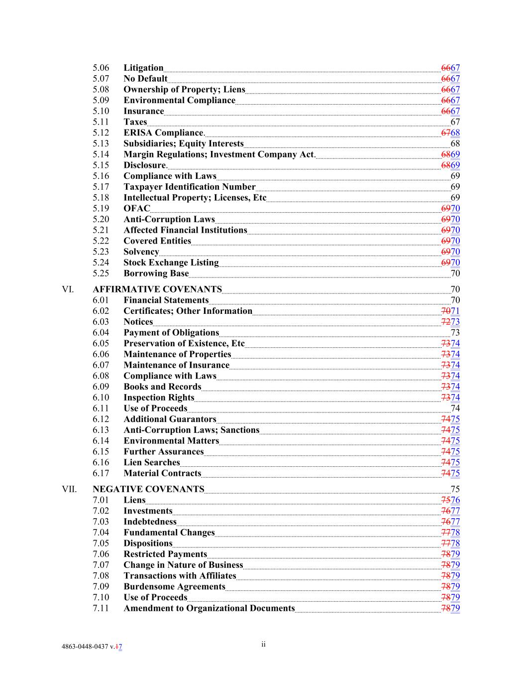 4863-0448-0437 v.17 ii 5.06 Litigation 6667 5.07 No Default 6667 5.08 Ownership of Property; Liens 6667 5.09 Environmental Compliance 6667 5.10 Insurance 6667 5.11 Taxes 67 5.12 ERISA Compliance. 6768 5.13 Subsidiaries; Equity Interests 68 5.14 Margin Regulations; Investment Company Act. 6869 5.15 Disclosure. 6869 5.16 Compliance with Laws 69 5.17 Taxpayer Identification Number 69 5.18 Intellectual Property; Licenses, Etc 69 5.19 OFAC 6970 5.20 Anti-Corruption Laws 6970 5.21 Affected Financial Institutions 6970 5.22 Covered Entities 6970 5.23 Solvency 6970 5.24 Stock Exchange Listing 6970 5.25 Borrowing Base 70 VI. AFFIRMATIVE COVENANTS 70 6.01 Financial Statements 70 6.02 Certificates; Other Information 7071 6.03 Notices 7273 6.04 Payment of Obligations 73 6.05 Preservation of Existence, Etc 7374 6.06 Maintenance of Properties 7374 6.07 Maintenance of Insurance 7374 6.08 Compliance with Laws 7374 6.09 Books and Records 7374 6.10 Inspection Rights 7374 6.11 Use of Proceeds 74 6.12 Additional Guarantors 7475 6.13 Anti-Corruption Laws; Sanctions 7475 6.14 Environmental Matters 7475 6.15 Further Assurances 7475 6.16 Lien Searches 7475 6.17 Material Contracts 7475 VII. NEGATIVE COVENANTS 75 7.01 Liens 7576 7.02 Investments 7677 7.03 Indebtedness 7677 7.04 Fundamental Changes 7778 7.05 Dispositions 7778 7.06 Restricted Payments 7879 7.07 Change in Nature of Business 7879 7.08 Transactions with Affiliates 7879 7.09 Burdensome Agreements 7879 7.10 Use of Proceeds 7879 7.11 Amendment to Organizational Documents 7879