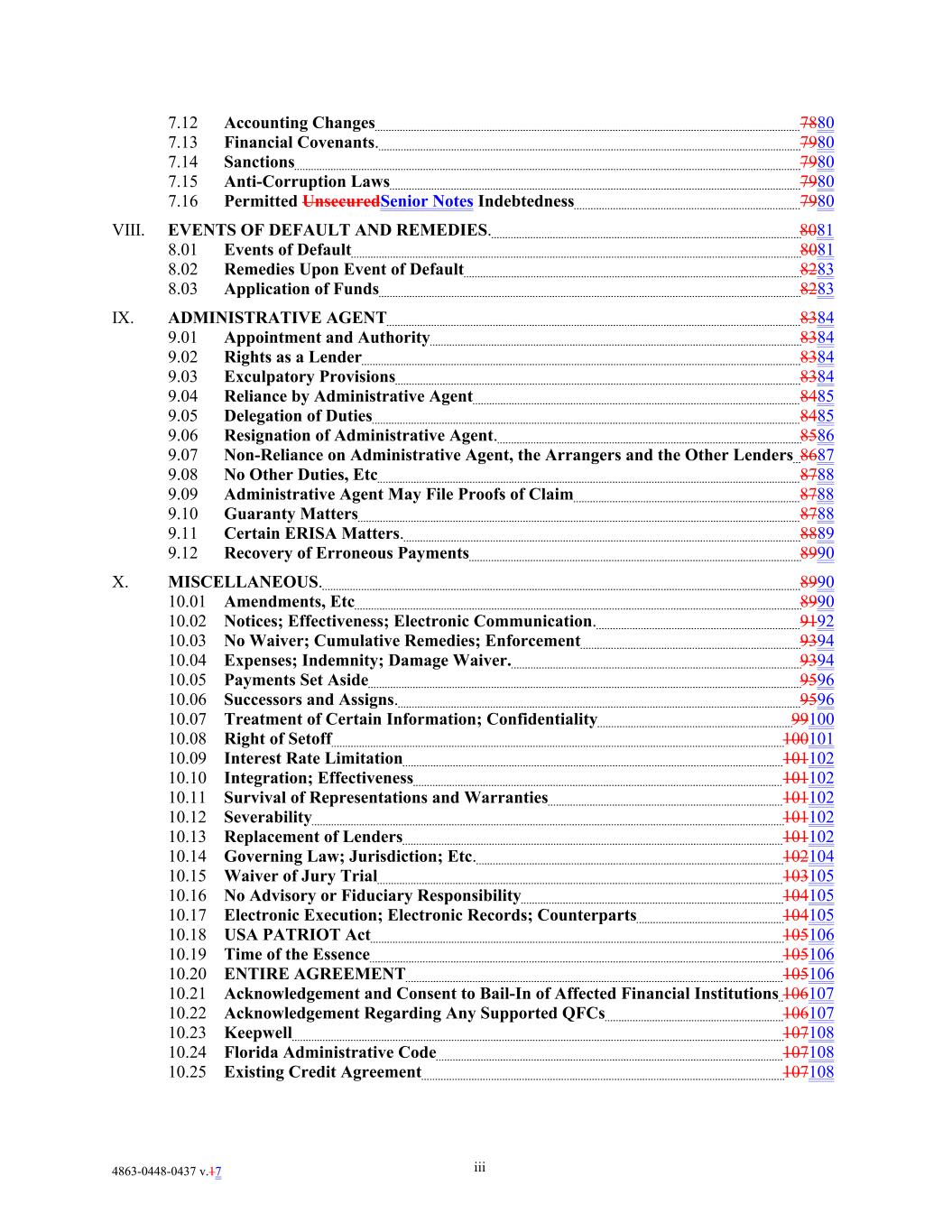 4863-0448-0437 v.17 iii 7.12 Accounting Changes 7880 7.13 Financial Covenants. 7980 7.14 Sanctions 7980 7.15 Anti-Corruption Laws 7980 7.16 Permitted UnsecuredSenior Notes Indebtedness 7980 VIII. EVENTS OF DEFAULT AND REMEDIES. 8081 8.01 Events of Default 8081 8.02 Remedies Upon Event of Default 8283 8.03 Application of Funds 8283 IX. ADMINISTRATIVE AGENT 8384 9.01 Appointment and Authority 8384 9.02 Rights as a Lender 8384 9.03 Exculpatory Provisions 8384 9.04 Reliance by Administrative Agent 8485 9.05 Delegation of Duties 8485 9.06 Resignation of Administrative Agent. 8586 9.07 Non-Reliance on Administrative Agent, the Arrangers and the Other Lenders 8687 9.08 No Other Duties, Etc 8788 9.09 Administrative Agent May File Proofs of Claim 8788 9.10 Guaranty Matters 8788 9.11 Certain ERISA Matters. 8889 9.12 Recovery of Erroneous Payments 8990 X. MISCELLANEOUS. 8990 10.01 Amendments, Etc 8990 10.02 Notices; Effectiveness; Electronic Communication. 9192 10.03 No Waiver; Cumulative Remedies; Enforcement 9394 10.04 Expenses; Indemnity; Damage Waiver. 9394 10.05 Payments Set Aside 9596 10.06 Successors and Assigns. 9596 10.07 Treatment of Certain Information; Confidentiality 99100 10.08 Right of Setoff 100101 10.09 Interest Rate Limitation 101102 10.10 Integration; Effectiveness 101102 10.11 Survival of Representations and Warranties 101102 10.12 Severability 101102 10.13 Replacement of Lenders 101102 10.14 Governing Law; Jurisdiction; Etc. 102104 10.15 Waiver of Jury Trial 103105 10.16 No Advisory or Fiduciary Responsibility 104105 10.17 Electronic Execution; Electronic Records; Counterparts 104105 10.18 USA PATRIOT Act 105106 10.19 Time of the Essence 105106 10.20 ENTIRE AGREEMENT 105106 10.21 Acknowledgement and Consent to Bail-In of Affected Financial Institutions 106107 10.22 Acknowledgement Regarding Any Supported QFCs 106107 10.23 Keepwell 107108 10.24 Florida Administrative Code 107108 10.25 Existing Credit Agreement 107108
