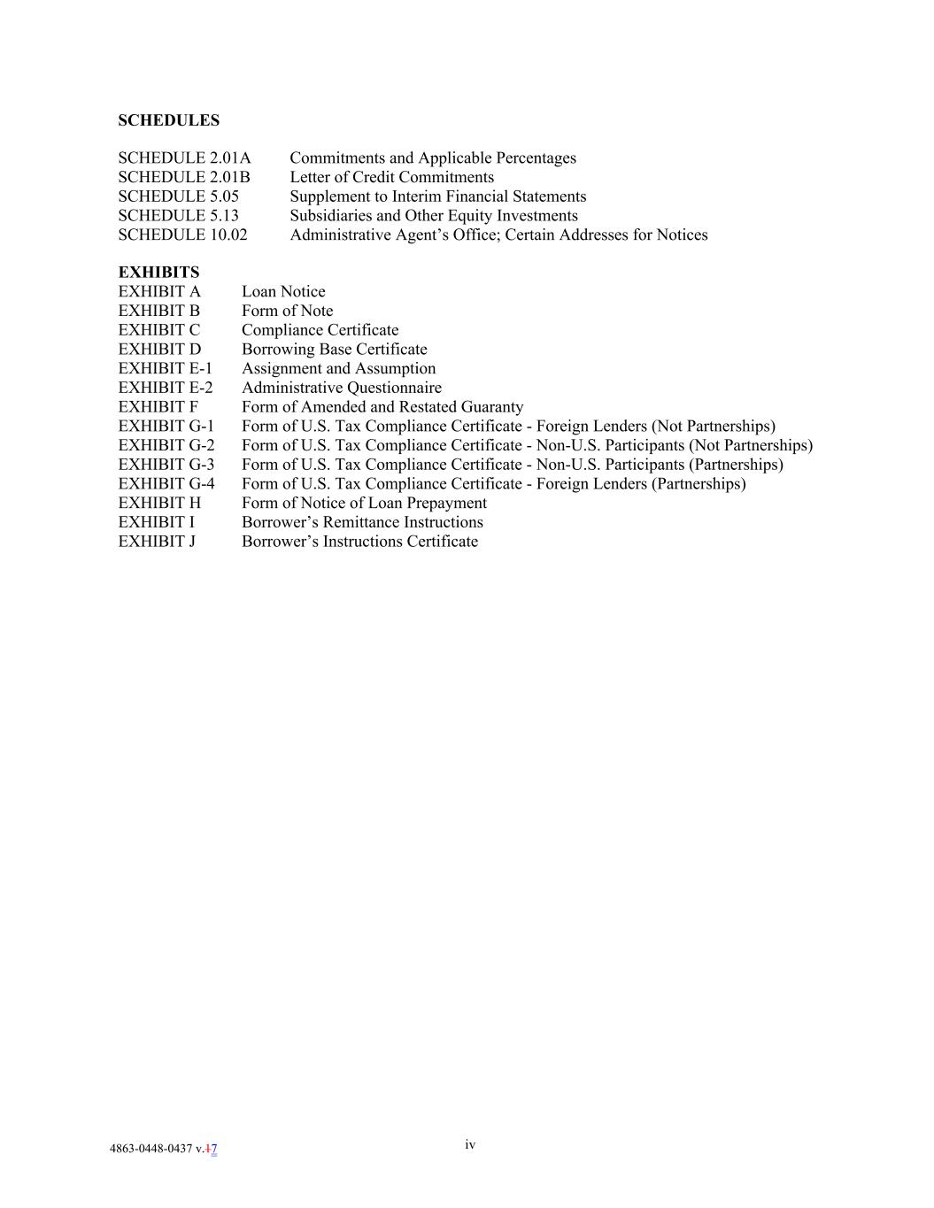 4863-0448-0437 v.17 iv EXHIBIT E-1 SCHEDULE 10.02 Assignment and Assumption Administrative Agent’s Office; Certain Addresses for Notices EXHIBIT E-2 Letter of Credit Commitments Administrative Questionnaire EXHIBIT F EXHIBITS Form of Amended and Restated Guaranty EXHIBIT G-1 SCHEDULE 2.01A Form of U.S. Tax Compliance Certificate - Foreign Lenders (Not Partnerships) EXHIBIT A SCHEDULE 5.05 EXHIBIT G-2 Loan Notice Form of U.S. Tax Compliance Certificate - Non-U.S. Participants (Not Partnerships) EXHIBIT G-3 Supplement to Interim Financial Statements Form of U.S. Tax Compliance Certificate - Non-U.S. Participants (Partnerships) EXHIBIT B Commitments and Applicable Percentages EXHIBIT G-4 Form of Note Form of U.S. Tax Compliance Certificate - Foreign Lenders (Partnerships) EXHIBIT H SCHEDULES Form of Notice of Loan Prepayment EXHIBIT C SCHEDULE 5.13 EXHIBIT I Compliance Certificate Borrower’s Remittance Instructions EXHIBIT J Subsidiaries and Other Equity Investments Borrower’s Instructions Certificate EXHIBIT D Borrowing Base Certificate SCHEDULE 2.01B