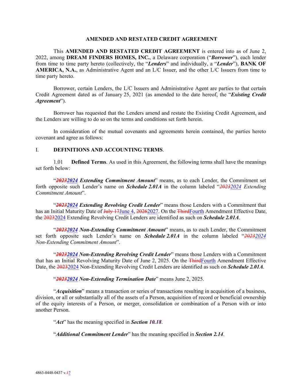 4863-0448-0437 v.17 AMENDED AND RESTATED CREDIT AGREEMENT This AMENDED AND RESTATED CREDIT AGREEMENT is entered into as of June 2, 2022, among DREAM FINDERS HOMES, INC., a Delaware corporation (“Borrower”), each lender from time to time party hereto (collectively, the “Lenders” and individually, a “Lender”), BANK OF AMERICA, N.A., as Administrative Agent and an L/C Issuer, and the other L/C Issuers from time to time party hereto. Borrower, certain Lenders, the L/C Issuers and Administrative Agent are parties to that certain Credit Agreement dated as of January 25, 2021 (as amended to the date hereof, the “Existing Credit Agreement”). Borrower has requested that the Lenders amend and restate the Existing Credit Agreement, and the Lenders are willing to do so on the terms and conditions set forth herein. In consideration of the mutual covenants and agreements herein contained, the parties hereto covenant and agree as follows: I. DEFINITIONS AND ACCOUNTING TERMS. 1.01 Defined Terms. As used in this Agreement, the following terms shall have the meanings set forth below: “20232024 Extending Commitment Amount” means, as to each Lender, the Commitment set forth opposite such Lender’s name on Schedule 2.01A in the column labeled “20232024 Extending Commitment Amount”. “20232024 Extending Revolving Credit Lender” means those Lenders with a Commitment that has an Initial Maturity Date of July 17June 4, 20262027. On the ThirdFourth Amendment Effective Date, the 20232024 Extending Revolving Credit Lenders are identified as such on Schedule 2.01A. “20232024 Non-Extending Commitment Amount” means, as to each Lender, the Commitment set forth opposite such Lender’s name on Schedule 2.01A in the column labeled “20232024 Non-Extending Commitment Amount”. “20232024 Non-Extending Revolving Credit Lender” means those Lenders with a Commitment that has an Initial Revolving Maturity Date of June 2, 2025. On the ThirdFourth Amendment Effective Date, the 20232024 Non-Extending Revolving Credit Lenders are identified as such on Schedule 2.01A. “20232024 Non-Extending Termination Date” means June 2, 2025. “Acquisition” means a transaction or series of transactions resulting in acquisition of a business, division, or all or substantially all of the assets of a Person, acquisition of record or beneficial ownership of the equity interests of a Person, or merger, consolidation or combination of a Person with or into another Person. “Act” has the meaning specified in Section 10.18. “Additional Commitment Lender” has the meaning specified in Section 2.14.