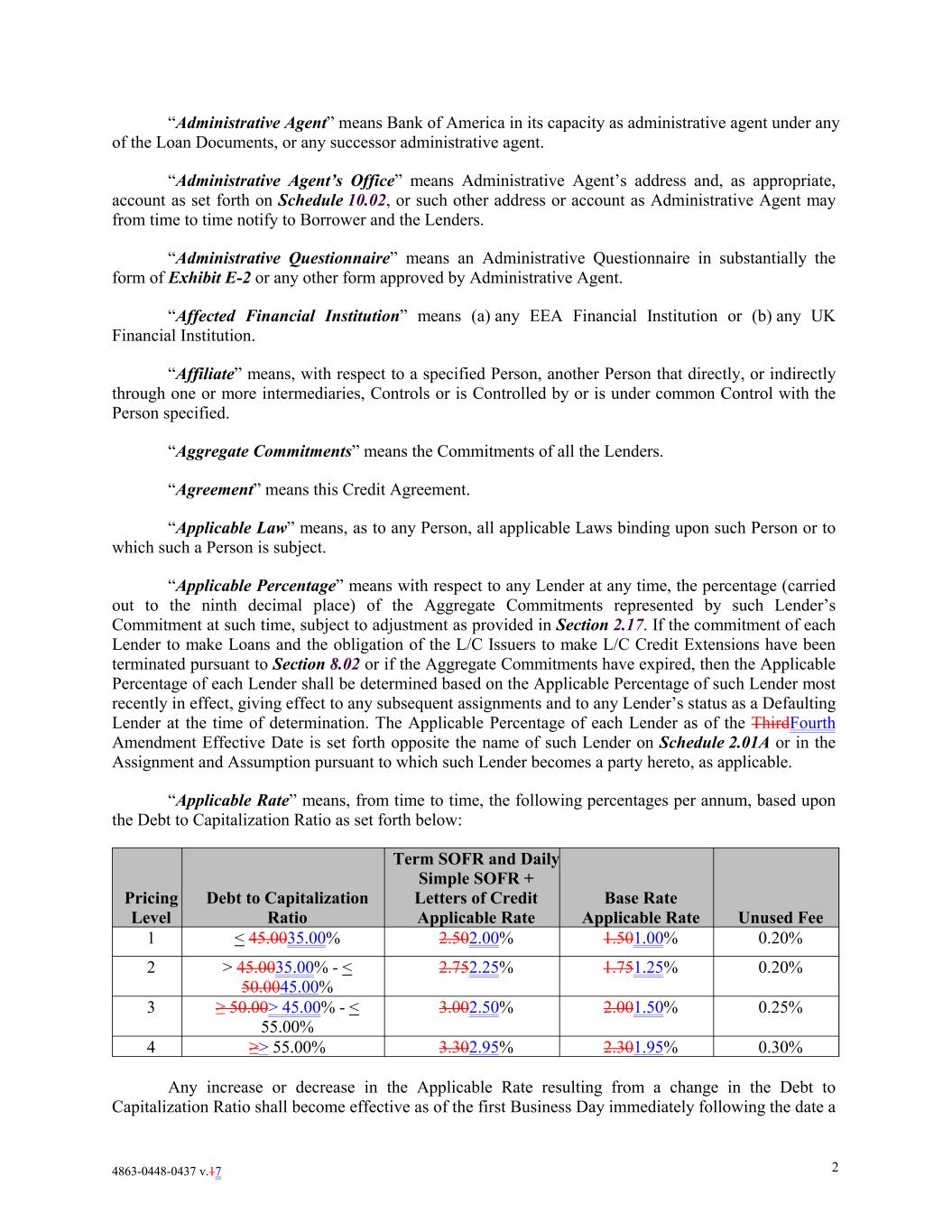 4863-0448-0437 v.17 2 3 < 45.0035.00% ≥ 50.00> 45.00% - < 55.00% “Administrative Agent” means Bank of America in its capacity as administrative agent under any of the Loan Documents, or any successor administrative agent. “Administrative Agent’s Office” means Administrative Agent’s address and, as appropriate, account as set forth on Schedule 10.02, or such other address or account as Administrative Agent may from time to time notify to Borrower and the Lenders. “Administrative Questionnaire” means an Administrative Questionnaire in substantially the form of Exhibit E-2 or any other form approved by Administrative Agent. “Affected Financial Institution” means (a) any EEA Financial Institution or (b) any UK Financial Institution. “Affiliate” means, with respect to a specified Person, another Person that directly, or indirectly through one or more intermediaries, Controls or is Controlled by or is under common Control with the Person specified. “Aggregate Commitments” means the Commitments of all the Lenders. “Agreement” means this Credit Agreement. “Applicable Law” means, as to any Person, all applicable Laws binding upon such Person or to which such a Person is subject. “Applicable Percentage” means with respect to any Lender at any time, the percentage (carried out to the ninth decimal place) of the Aggregate Commitments represented by such Lender’s Commitment at such time, subject to adjustment as provided in Section 2.17. If the commitment of each Lender to make Loans and the obligation of the L/C Issuers to make L/C Credit Extensions have been terminated pursuant to Section 8.02 or if the Aggregate Commitments have expired, then the Applicable Percentage of each Lender shall be determined based on the Applicable Percentage of such Lender most recently in effect, giving effect to any subsequent assignments and to any Lender’s status as a Defaulting Lender at the time of determination. The Applicable Percentage of each Lender as of the ThirdFourth Amendment Effective Date is set forth opposite the name of such Lender on Schedule 2.01A or in the Assignment and Assumption pursuant to which such Lender becomes a party hereto, as applicable. “Applicable Rate” means, from time to time, the following percentages per annum, based upon the Debt to Capitalization Ratio as set forth below: 3.002.50% 2.502.00% 2.001.50% Term SOFR and Daily Simple SOFR + Letters of Credit Applicable Rate 0.25% 1.501.00% 4 0.20% ≥> 55.00% Base Rate Applicable Rate 3.302.95% 2.301.95% 0.30% 2 Unused Fee > 45.0035.00% - < 50.0045.00% Pricing Level 2.752.25% 1.751.25% Any increase or decrease in the Applicable Rate resulting from a change in the Debt to Capitalization Ratio shall become effective as of the first Business Day immediately following the date a 0.20% 1 Debt to Capitalization Ratio