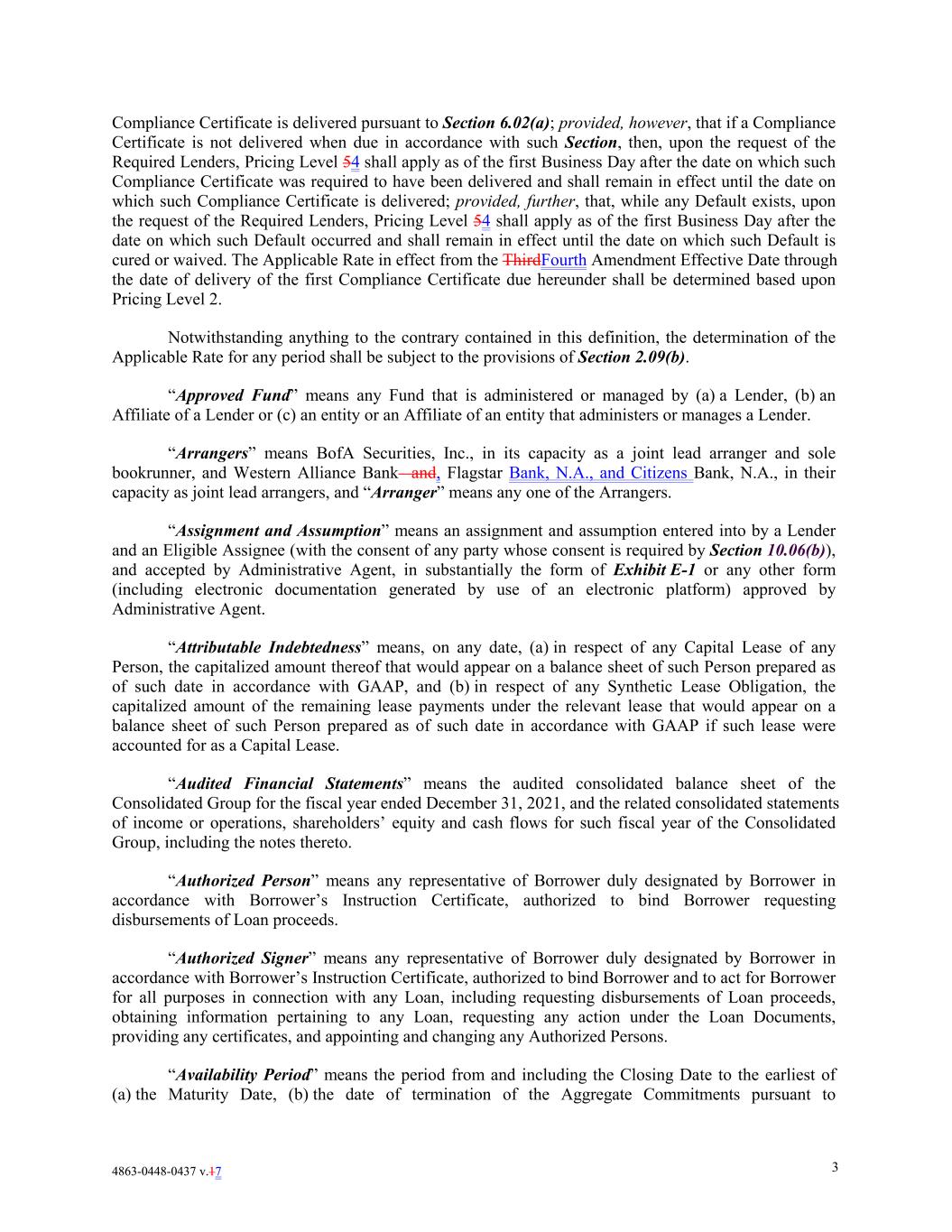 4863-0448-0437 v.17 3 Compliance Certificate is delivered pursuant to Section 6.02(a); provided, however, that if a Compliance Certificate is not delivered when due in accordance with such Section, then, upon the request of the Required Lenders, Pricing Level 54 shall apply as of the first Business Day after the date on which such Compliance Certificate was required to have been delivered and shall remain in effect until the date on which such Compliance Certificate is delivered; provided, further, that, while any Default exists, upon the request of the Required Lenders, Pricing Level 54 shall apply as of the first Business Day after the date on which such Default occurred and shall remain in effect until the date on which such Default is cured or waived. The Applicable Rate in effect from the ThirdFourth Amendment Effective Date through the date of delivery of the first Compliance Certificate due hereunder shall be determined based upon Pricing Level 2. Notwithstanding anything to the contrary contained in this definition, the determination of the Applicable Rate for any period shall be subject to the provisions of Section 2.09(b). “Approved Fund” means any Fund that is administered or managed by (a) a Lender, (b) an Affiliate of a Lender or (c) an entity or an Affiliate of an entity that administers or manages a Lender. “Arrangers” means BofA Securities, Inc., in its capacity as a joint lead arranger and sole bookrunner, and Western Alliance Bank and, Flagstar Bank, N.A., and Citizens Bank, N.A., in their capacity as joint lead arrangers, and “Arranger” means any one of the Arrangers. “Assignment and Assumption” means an assignment and assumption entered into by a Lender and an Eligible Assignee (with the consent of any party whose consent is required by Section 10.06(b)), and accepted by Administrative Agent, in substantially the form of Exhibit E-1 or any other form (including electronic documentation generated by use of an electronic platform) approved by Administrative Agent. “Attributable Indebtedness” means, on any date, (a) in respect of any Capital Lease of any Person, the capitalized amount thereof that would appear on a balance sheet of such Person prepared as of such date in accordance with GAAP, and (b) in respect of any Synthetic Lease Obligation, the capitalized amount of the remaining lease payments under the relevant lease that would appear on a balance sheet of such Person prepared as of such date in accordance with GAAP if such lease were accounted for as a Capital Lease. “Audited Financial Statements” means the audited consolidated balance sheet of the Consolidated Group for the fiscal year ended December 31, 2021, and the related consolidated statements of income or operations, shareholders’ equity and cash flows for such fiscal year of the Consolidated Group, including the notes thereto. “Authorized Person” means any representative of Borrower duly designated by Borrower in accordance with Borrower’s Instruction Certificate, authorized to bind Borrower requesting disbursements of Loan proceeds. “Authorized Signer” means any representative of Borrower duly designated by Borrower in accordance with Borrower’s Instruction Certificate, authorized to bind Borrower and to act for Borrower for all purposes in connection with any Loan, including requesting disbursements of Loan proceeds, obtaining information pertaining to any Loan, requesting any action under the Loan Documents, providing any certificates, and appointing and changing any Authorized Persons. “Availability Period” means the period from and including the Closing Date to the earliest of (a) the Maturity Date, (b) the date of termination of the Aggregate Commitments pursuant to