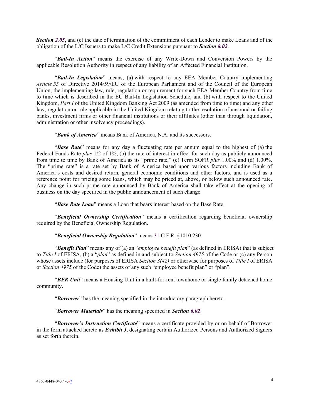 4863-0448-0437 v.17 4 Section 2.05, and (c) the date of termination of the commitment of each Lender to make Loans and of the obligation of the L/C Issuers to make L/C Credit Extensions pursuant to Section 8.02. “Bail-In Action” means the exercise of any Write-Down and Conversion Powers by the applicable Resolution Authority in respect of any liability of an Affected Financial Institution. “Bail-In Legislation” means, (a) with respect to any EEA Member Country implementing Article 55 of Directive 2014/59/EU of the European Parliament and of the Council of the European Union, the implementing law, rule, regulation or requirement for such EEA Member Country from time to time which is described in the EU Bail-In Legislation Schedule, and (b) with respect to the United Kingdom, Part I of the United Kingdom Banking Act 2009 (as amended from time to time) and any other law, regulation or rule applicable in the United Kingdom relating to the resolution of unsound or failing banks, investment firms or other financial institutions or their affiliates (other than through liquidation, administration or other insolvency proceedings). “Bank of America” means Bank of America, N.A. and its successors. “Base Rate” means for any day a fluctuating rate per annum equal to the highest of (a) the Federal Funds Rate plus 1/2 of 1%, (b) the rate of interest in effect for such day as publicly announced from time to time by Bank of America as its “prime rate,” (c) Term SOFR plus 1.00% and (d) 1.00%. The “prime rate” is a rate set by Bank of America based upon various factors including Bank of America’s costs and desired return, general economic conditions and other factors, and is used as a reference point for pricing some loans, which may be priced at, above, or below such announced rate. Any change in such prime rate announced by Bank of America shall take effect at the opening of business on the day specified in the public announcement of such change. “Base Rate Loan” means a Loan that bears interest based on the Base Rate. “Beneficial Ownership Certification” means a certification regarding beneficial ownership required by the Beneficial Ownership Regulation. “Beneficial Ownership Regulation” means 31 C.F.R. §1010.230. “Benefit Plan” means any of (a) an “employee benefit plan” (as defined in ERISA) that is subject to Title I of ERISA, (b) a “plan” as defined in and subject to Section 4975 of the Code or (c) any Person whose assets include (for purposes of ERISA Section 3(42) or otherwise for purposes of Title I of ERISA or Section 4975 of the Code) the assets of any such “employee benefit plan” or “plan”. “BFR Unit” means a Housing Unit in a built-for-rent townhome or single family detached home community. “Borrower” has the meaning specified in the introductory paragraph hereto. “Borrower Materials” has the meaning specified in Section 6.02. “Borrower’s Instruction Certificate” means a certificate provided by or on behalf of Borrower in the form attached hereto as Exhibit J, designating certain Authorized Persons and Authorized Signers as set forth therein.