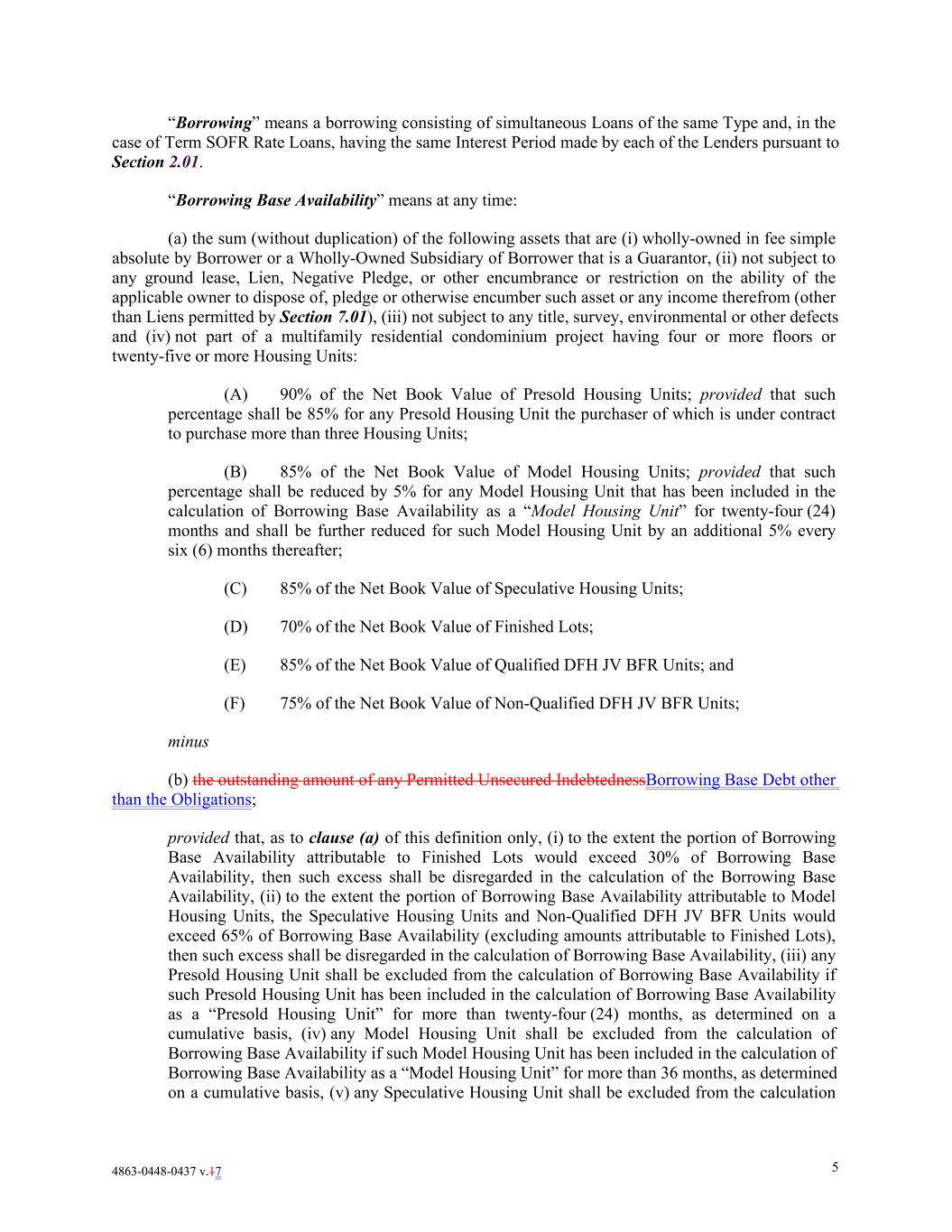 4863-0448-0437 v.17 5 “Borrowing” means a borrowing consisting of simultaneous Loans of the same Type and, in the case of Term SOFR Rate Loans, having the same Interest Period made by each of the Lenders pursuant to Section 2.01. “Borrowing Base Availability” means at any time: (a) the sum (without duplication) of the following assets that are (i) wholly-owned in fee simple absolute by Borrower or a Wholly-Owned Subsidiary of Borrower that is a Guarantor, (ii) not subject to any ground lease, Lien, Negative Pledge, or other encumbrance or restriction on the ability of the applicable owner to dispose of, pledge or otherwise encumber such asset or any income therefrom (other than Liens permitted by Section 7.01), (iii) not subject to any title, survey, environmental or other defects and (iv) not part of a multifamily residential condominium project having four or more floors or twenty-five or more Housing Units: (A) 90% of the Net Book Value of Presold Housing Units; provided that such percentage shall be 85% for any Presold Housing Unit the purchaser of which is under contract to purchase more than three Housing Units; (B) 85% of the Net Book Value of Model Housing Units; provided that such percentage shall be reduced by 5% for any Model Housing Unit that has been included in the calculation of Borrowing Base Availability as a “Model Housing Unit” for twenty-four (24) months and shall be further reduced for such Model Housing Unit by an additional 5% every six (6) months thereafter; (C) 85% of the Net Book Value of Speculative Housing Units; (D) 70% of the Net Book Value of Finished Lots; (E) 85% of the Net Book Value of Qualified DFH JV BFR Units; and (F) 75% of the Net Book Value of Non-Qualified DFH JV BFR Units; minus (b) the outstanding amount of any Permitted Unsecured IndebtednessBorrowing Base Debt other than the Obligations; provided that, as to clause (a) of this definition only, (i) to the extent the portion of Borrowing Base Availability attributable to Finished Lots would exceed 30% of Borrowing Base Availability, then such excess shall be disregarded in the calculation of the Borrowing Base Availability, (ii) to the extent the portion of Borrowing Base Availability attributable to Model Housing Units, the Speculative Housing Units and Non-Qualified DFH JV BFR Units would exceed 65% of Borrowing Base Availability (excluding amounts attributable to Finished Lots), then such excess shall be disregarded in the calculation of Borrowing Base Availability, (iii) any Presold Housing Unit shall be excluded from the calculation of Borrowing Base Availability if such Presold Housing Unit has been included in the calculation of Borrowing Base Availability as a “Presold Housing Unit” for more than twenty-four (24) months, as determined on a cumulative basis, (iv) any Model Housing Unit shall be excluded from the calculation of Borrowing Base Availability if such Model Housing Unit has been included in the calculation of Borrowing Base Availability as a “Model Housing Unit” for more than 36 months, as determined on a cumulative basis, (v) any Speculative Housing Unit shall be excluded from the calculation