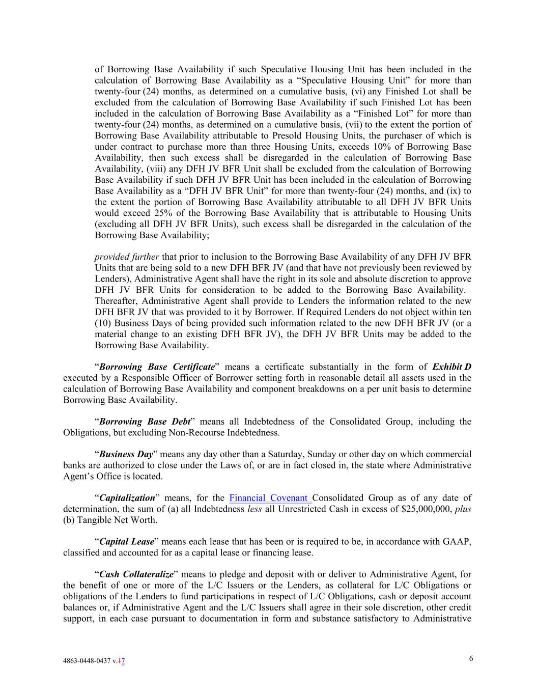 4863-0448-0437 v.17 6 of Borrowing Base Availability if such Speculative Housing Unit has been included in the calculation of Borrowing Base Availability as a “Speculative Housing Unit” for more than twenty-four (24) months, as determined on a cumulative basis, (vi) any Finished Lot shall be excluded from the calculation of Borrowing Base Availability if such Finished Lot has been included in the calculation of Borrowing Base Availability as a “Finished Lot” for more than twenty-four (24) months, as determined on a cumulative basis, (vii) to the extent the portion of Borrowing Base Availability attributable to Presold Housing Units, the purchaser of which is under contract to purchase more than three Housing Units, exceeds 10% of Borrowing Base Availability, then such excess shall be disregarded in the calculation of Borrowing Base Availability, (viii) any DFH JV BFR Unit shall be excluded from the calculation of Borrowing Base Availability if such DFH JV BFR Unit has been included in the calculation of Borrowing Base Availability as a “DFH JV BFR Unit” for more than twenty-four (24) months, and (ix) to the extent the portion of Borrowing Base Availability attributable to all DFH JV BFR Units would exceed 25% of the Borrowing Base Availability that is attributable to Housing Units (excluding all DFH JV BFR Units), such excess shall be disregarded in the calculation of the Borrowing Base Availability; provided further that prior to inclusion to the Borrowing Base Availability of any DFH JV BFR Units that are being sold to a new DFH BFR JV (and that have not previously been reviewed by Lenders), Administrative Agent shall have the right in its sole and absolute discretion to approve DFH JV BFR Units for consideration to be added to the Borrowing Base Availability. Thereafter, Administrative Agent shall provide to Lenders the information related to the new DFH BFR JV that was provided to it by Borrower. If Required Lenders do not object within ten (10) Business Days of being provided such information related to the new DFH BFR JV (or a material change to an existing DFH BFR JV), the DFH JV BFR Units may be added to the Borrowing Base Availability. “Borrowing Base Certificate” means a certificate substantially in the form of Exhibit D executed by a Responsible Officer of Borrower setting forth in reasonable detail all assets used in the calculation of Borrowing Base Availability and component breakdowns on a per unit basis to determine Borrowing Base Availability. “Borrowing Base Debt” means all Indebtedness of the Consolidated Group, including the Obligations, but excluding Non-Recourse Indebtedness. “Business Day” means any day other than a Saturday, Sunday or other day on which commercial banks are authorized to close under the Laws of, or are in fact closed in, the state where Administrative Agent’s Office is located. “Capitalization” means, for the Financial Covenant Consolidated Group as of any date of determination, the sum of (a) all Indebtedness less all Unrestricted Cash in excess of $25,000,000, plus (b) Tangible Net Worth. “Capital Lease” means each lease that has been or is required to be, in accordance with GAAP, classified and accounted for as a capital lease or financing lease. “Cash Collateralize” means to pledge and deposit with or deliver to Administrative Agent, for the benefit of one or more of the L/C Issuers or the Lenders, as collateral for L/C Obligations or obligations of the Lenders to fund participations in respect of L/C Obligations, cash or deposit account balances or, if Administrative Agent and the L/C Issuers shall agree in their sole discretion, other credit support, in each case pursuant to documentation in form and substance satisfactory to Administrative