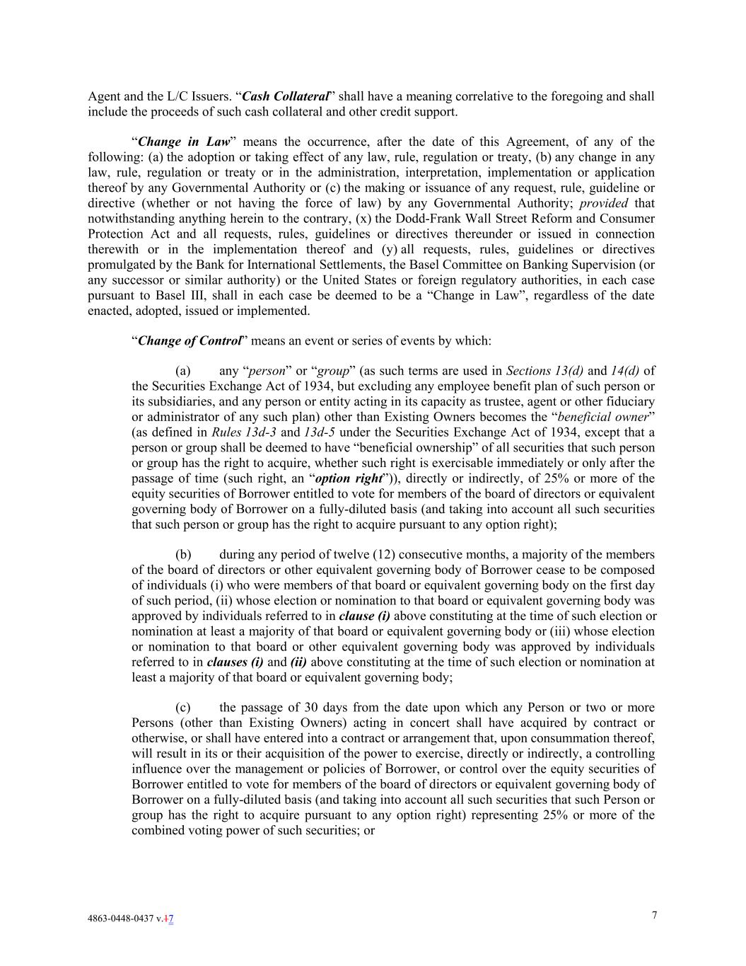 4863-0448-0437 v.17 7 Agent and the L/C Issuers. “Cash Collateral” shall have a meaning correlative to the foregoing and shall include the proceeds of such cash collateral and other credit support. “Change in Law” means the occurrence, after the date of this Agreement, of any of the following: (a) the adoption or taking effect of any law, rule, regulation or treaty, (b) any change in any law, rule, regulation or treaty or in the administration, interpretation, implementation or application thereof by any Governmental Authority or (c) the making or issuance of any request, rule, guideline or directive (whether or not having the force of law) by any Governmental Authority; provided that notwithstanding anything herein to the contrary, (x) the Dodd-Frank Wall Street Reform and Consumer Protection Act and all requests, rules, guidelines or directives thereunder or issued in connection therewith or in the implementation thereof and (y) all requests, rules, guidelines or directives promulgated by the Bank for International Settlements, the Basel Committee on Banking Supervision (or any successor or similar authority) or the United States or foreign regulatory authorities, in each case pursuant to Basel III, shall in each case be deemed to be a “Change in Law”, regardless of the date enacted, adopted, issued or implemented. “Change of Control” means an event or series of events by which: (a) any “person” or “group” (as such terms are used in Sections 13(d) and 14(d) of the Securities Exchange Act of 1934, but excluding any employee benefit plan of such person or its subsidiaries, and any person or entity acting in its capacity as trustee, agent or other fiduciary or administrator of any such plan) other than Existing Owners becomes the “beneficial owner” (as defined in Rules 13d-3 and 13d-5 under the Securities Exchange Act of 1934, except that a person or group shall be deemed to have “beneficial ownership” of all securities that such person or group has the right to acquire, whether such right is exercisable immediately or only after the passage of time (such right, an “option right”)), directly or indirectly, of 25% or more of the equity securities of Borrower entitled to vote for members of the board of directors or equivalent governing body of Borrower on a fully-diluted basis (and taking into account all such securities that such person or group has the right to acquire pursuant to any option right); (b) during any period of twelve (12) consecutive months, a majority of the members of the board of directors or other equivalent governing body of Borrower cease to be composed of individuals (i) who were members of that board or equivalent governing body on the first day of such period, (ii) whose election or nomination to that board or equivalent governing body was approved by individuals referred to in clause (i) above constituting at the time of such election or nomination at least a majority of that board or equivalent governing body or (iii) whose election or nomination to that board or other equivalent governing body was approved by individuals referred to in clauses (i) and (ii) above constituting at the time of such election or nomination at least a majority of that board or equivalent governing body; (c) the passage of 30 days from the date upon which any Person or two or more Persons (other than Existing Owners) acting in concert shall have acquired by contract or otherwise, or shall have entered into a contract or arrangement that, upon consummation thereof, will result in its or their acquisition of the power to exercise, directly or indirectly, a controlling influence over the management or policies of Borrower, or control over the equity securities of Borrower entitled to vote for members of the board of directors or equivalent governing body of Borrower on a fully-diluted basis (and taking into account all such securities that such Person or group has the right to acquire pursuant to any option right) representing 25% or more of the combined voting power of such securities; or