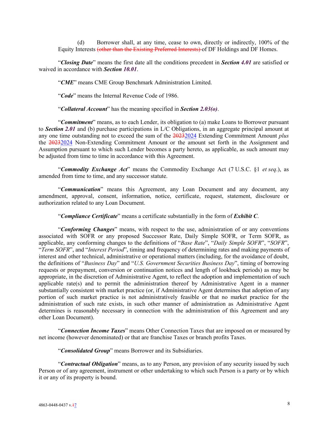 4863-0448-0437 v.17 8 (d) Borrower shall, at any time, cease to own, directly or indirectly, 100% of the Equity Interests (other than the Existing Preferred Interests) of DF Holdings and DF Homes. “Closing Date” means the first date all the conditions precedent in Section 4.01 are satisfied or waived in accordance with Section 10.01. “CME” means CME Group Benchmark Administration Limited. “Code” means the Internal Revenue Code of 1986. “Collateral Account” has the meaning specified in Section 2.03(o). “Commitment” means, as to each Lender, its obligation to (a) make Loans to Borrower pursuant to Section 2.01 and (b) purchase participations in L/C Obligations, in an aggregate principal amount at any one time outstanding not to exceed the sum of the 20232024 Extending Commitment Amount plus the 20232024 Non-Extending Commitment Amount or the amount set forth in the Assignment and Assumption pursuant to which such Lender becomes a party hereto, as applicable, as such amount may be adjusted from time to time in accordance with this Agreement. “Commodity Exchange Act” means the Commodity Exchange Act (7 U.S.C. §1 et seq.), as amended from time to time, and any successor statute. “Communication” means this Agreement, any Loan Document and any document, any amendment, approval, consent, information, notice, certificate, request, statement, disclosure or authorization related to any Loan Document. “Compliance Certificate” means a certificate substantially in the form of Exhibit C. “Conforming Changes” means, with respect to the use, administration of or any conventions associated with SOFR or any proposed Successor Rate, Daily Simple SOFR, or Term SOFR, as applicable, any conforming changes to the definitions of “Base Rate”, “Daily Simple SOFR”, “SOFR”, “Term SOFR”, and “Interest Period”, timing and frequency of determining rates and making payments of interest and other technical, administrative or operational matters (including, for the avoidance of doubt, the definitions of “Business Day” and “U.S. Government Securities Business Day”, timing of borrowing requests or prepayment, conversion or continuation notices and length of lookback periods) as may be appropriate, in the discretion of Administrative Agent, to reflect the adoption and implementation of such applicable rate(s) and to permit the administration thereof by Administrative Agent in a manner substantially consistent with market practice (or, if Administrative Agent determines that adoption of any portion of such market practice is not administratively feasible or that no market practice for the administration of such rate exists, in such other manner of administration as Administrative Agent determines is reasonably necessary in connection with the administration of this Agreement and any other Loan Document). “Connection Income Taxes” means Other Connection Taxes that are imposed on or measured by net income (however denominated) or that are franchise Taxes or branch profits Taxes. “Consolidated Group” means Borrower and its Subsidiaries. “Contractual Obligation” means, as to any Person, any provision of any security issued by such Person or of any agreement, instrument or other undertaking to which such Person is a party or by which it or any of its property is bound.