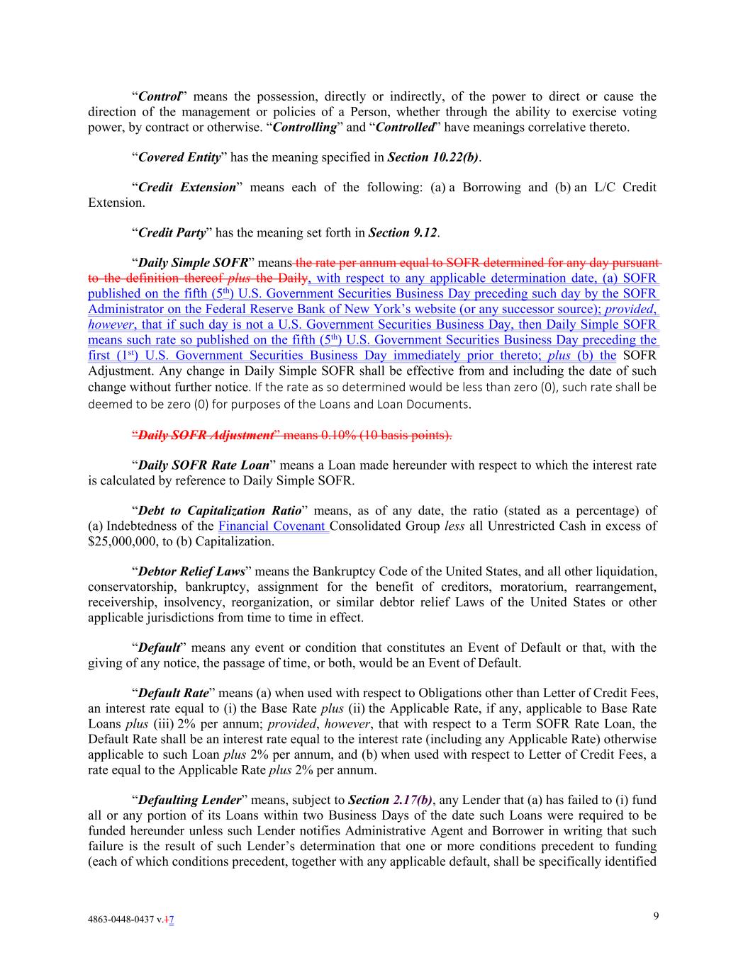 4863-0448-0437 v.17 9 “Control” means the possession, directly or indirectly, of the power to direct or cause the direction of the management or policies of a Person, whether through the ability to exercise voting power, by contract or otherwise. “Controlling” and “Controlled” have meanings correlative thereto. “Covered Entity” has the meaning specified in Section 10.22(b). “Credit Extension” means each of the following: (a) a Borrowing and (b) an L/C Credit Extension. “Credit Party” has the meaning set forth in Section 9.12. “Daily Simple SOFR” means the rate per annum equal to SOFR determined for any day pursuant to the definition thereof plus the Daily, with respect to any applicable determination date, (a) SOFR published on the fifth (5th) U.S. Government Securities Business Day preceding such day by the SOFR Administrator on the Federal Reserve Bank of New York’s website (or any successor source); provided, however, that if such day is not a U.S. Government Securities Business Day, then Daily Simple SOFR means such rate so published on the fifth (5th) U.S. Government Securities Business Day preceding the first (1st) U.S. Government Securities Business Day immediately prior thereto; plus (b) the SOFR Adjustment. Any change in Daily Simple SOFR shall be effective from and including the date of such change without further notice. If the rate as so determined would be less than zero (0), such rate shall be deemed to be zero (0) for purposes of the Loans and Loan Documents. “Daily SOFR Adjustment” means 0.10% (10 basis points). “Daily SOFR Rate Loan” means a Loan made hereunder with respect to which the interest rate is calculated by reference to Daily Simple SOFR. “Debt to Capitalization Ratio” means, as of any date, the ratio (stated as a percentage) of (a) Indebtedness of the Financial Covenant Consolidated Group less all Unrestricted Cash in excess of $25,000,000, to (b) Capitalization. “Debtor Relief Laws” means the Bankruptcy Code of the United States, and all other liquidation, conservatorship, bankruptcy, assignment for the benefit of creditors, moratorium, rearrangement, receivership, insolvency, reorganization, or similar debtor relief Laws of the United States or other applicable jurisdictions from time to time in effect. “Default” means any event or condition that constitutes an Event of Default or that, with the giving of any notice, the passage of time, or both, would be an Event of Default. “Default Rate” means (a) when used with respect to Obligations other than Letter of Credit Fees, an interest rate equal to (i) the Base Rate plus (ii) the Applicable Rate, if any, applicable to Base Rate Loans plus (iii) 2% per annum; provided, however, that with respect to a Term SOFR Rate Loan, the Default Rate shall be an interest rate equal to the interest rate (including any Applicable Rate) otherwise applicable to such Loan plus 2% per annum, and (b) when used with respect to Letter of Credit Fees, a rate equal to the Applicable Rate plus 2% per annum. “Defaulting Lender” means, subject to Section 2.17(b), any Lender that (a) has failed to (i) fund all or any portion of its Loans within two Business Days of the date such Loans were required to be funded hereunder unless such Lender notifies Administrative Agent and Borrower in writing that such failure is the result of such Lender’s determination that one or more conditions precedent to funding (each of which conditions precedent, together with any applicable default, shall be specifically identified