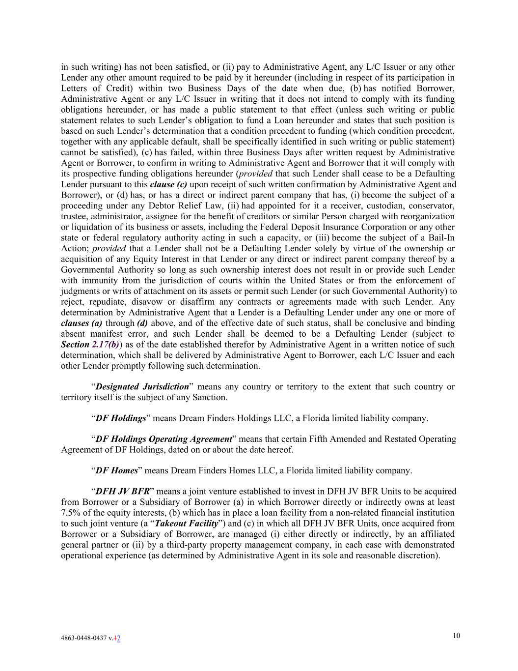 4863-0448-0437 v.17 10 in such writing) has not been satisfied, or (ii) pay to Administrative Agent, any L/C Issuer or any other Lender any other amount required to be paid by it hereunder (including in respect of its participation in Letters of Credit) within two Business Days of the date when due, (b) has notified Borrower, Administrative Agent or any L/C Issuer in writing that it does not intend to comply with its funding obligations hereunder, or has made a public statement to that effect (unless such writing or public statement relates to such Lender’s obligation to fund a Loan hereunder and states that such position is based on such Lender’s determination that a condition precedent to funding (which condition precedent, together with any applicable default, shall be specifically identified in such writing or public statement) cannot be satisfied), (c) has failed, within three Business Days after written request by Administrative Agent or Borrower, to confirm in writing to Administrative Agent and Borrower that it will comply with its prospective funding obligations hereunder (provided that such Lender shall cease to be a Defaulting Lender pursuant to this clause (c) upon receipt of such written confirmation by Administrative Agent and Borrower), or (d) has, or has a direct or indirect parent company that has, (i) become the subject of a proceeding under any Debtor Relief Law, (ii) had appointed for it a receiver, custodian, conservator, trustee, administrator, assignee for the benefit of creditors or similar Person charged with reorganization or liquidation of its business or assets, including the Federal Deposit Insurance Corporation or any other state or federal regulatory authority acting in such a capacity, or (iii) become the subject of a Bail-In Action; provided that a Lender shall not be a Defaulting Lender solely by virtue of the ownership or acquisition of any Equity Interest in that Lender or any direct or indirect parent company thereof by a Governmental Authority so long as such ownership interest does not result in or provide such Lender with immunity from the jurisdiction of courts within the United States or from the enforcement of judgments or writs of attachment on its assets or permit such Lender (or such Governmental Authority) to reject, repudiate, disavow or disaffirm any contracts or agreements made with such Lender. Any determination by Administrative Agent that a Lender is a Defaulting Lender under any one or more of clauses (a) through (d) above, and of the effective date of such status, shall be conclusive and binding absent manifest error, and such Lender shall be deemed to be a Defaulting Lender (subject to Section 2.17(b)) as of the date established therefor by Administrative Agent in a written notice of such determination, which shall be delivered by Administrative Agent to Borrower, each L/C Issuer and each other Lender promptly following such determination. “Designated Jurisdiction” means any country or territory to the extent that such country or territory itself is the subject of any Sanction. “DF Holdings” means Dream Finders Holdings LLC, a Florida limited liability company. “DF Holdings Operating Agreement” means that certain Fifth Amended and Restated Operating Agreement of DF Holdings, dated on or about the date hereof. “DF Homes” means Dream Finders Homes LLC, a Florida limited liability company. “DFH JV BFR” means a joint venture established to invest in DFH JV BFR Units to be acquired from Borrower or a Subsidiary of Borrower (a) in which Borrower directly or indirectly owns at least 7.5% of the equity interests, (b) which has in place a loan facility from a non-related financial institution to such joint venture (a “Takeout Facility”) and (c) in which all DFH JV BFR Units, once acquired from Borrower or a Subsidiary of Borrower, are managed (i) either directly or indirectly, by an affiliated general partner or (ii) by a third-party property management company, in each case with demonstrated operational experience (as determined by Administrative Agent in its sole and reasonable discretion).