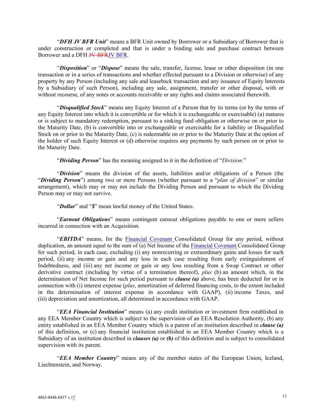 4863-0448-0437 v.17 11 “DFH JV BFR Unit” means a BFR Unit owned by Borrower or a Subsidiary of Borrower that is under construction or completed and that is under a binding sale and purchase contract between Borrower and a DFH JV-BFRJV BFR. “Disposition” or “Dispose” means the sale, transfer, license, lease or other disposition (in one transaction or in a series of transactions and whether effected pursuant to a Division or otherwise) of any property by any Person (including any sale and leaseback transaction and any issuance of Equity Interests by a Subsidiary of such Person), including any sale, assignment, transfer or other disposal, with or without recourse, of any notes or accounts receivable or any rights and claims associated therewith. “Disqualified Stock” means any Equity Interest of a Person that by its terms (or by the terms of any Equity Interest into which it is convertible or for which it is exchangeable or exercisable) (a) matures or is subject to mandatory redemption, pursuant to a sinking fund obligation or otherwise on or prior to the Maturity Date, (b) is convertible into or exchangeable or exercisable for a liability or Disqualified Stock on or prior to the Maturity Date, (c) is redeemable on or prior to the Maturity Date at the option of the holder of such Equity Interest or (d) otherwise requires any payments by such person on or prior to the Maturity Date. “Dividing Person” has the meaning assigned to it in the definition of “Division.” “Division” means the division of the assets, liabilities and/or obligations of a Person (the “Dividing Person”) among two or more Persons (whether pursuant to a “plan of division” or similar arrangement), which may or may not include the Dividing Person and pursuant to which the Dividing Person may or may not survive. “Dollar” and “$” mean lawful money of the United States. “Earnout Obligations” means contingent earnout obligations payable to one or more sellers incurred in connection with an Acquisition. “EBITDA” means, for the Financial Covenant Consolidated Group for any period, without duplication, an amount equal to the sum of (a) Net Income of the Financial Covenant Consolidated Group for such period, in each case, excluding (i) any nonrecurring or extraordinary gains and losses for such period, (ii) any income or gain and any loss in each case resulting from early extinguishment of Indebtedness, and (iii) any net income or gain or any loss resulting from a Swap Contract or other derivative contract (including by virtue of a termination thereof), plus (b) an amount which, in the determination of Net Income for such period pursuant to clause (a) above, has been deducted for or in connection with (i) interest expense (plus, amortization of deferred financing costs, to the extent included in the determination of interest expense in accordance with GAAP), (ii) income Taxes, and (iii) depreciation and amortization, all determined in accordance with GAAP. “EEA Financial Institution” means (a) any credit institution or investment firm established in any EEA Member Country which is subject to the supervision of an EEA Resolution Authority, (b) any entity established in an EEA Member Country which is a parent of an institution described in clause (a) of this definition, or (c) any financial institution established in an EEA Member Country which is a Subsidiary of an institution described in clauses (a) or (b) of this definition and is subject to consolidated supervision with its parent. “EEA Member Country” means any of the member states of the European Union, Iceland, Liechtenstein, and Norway.