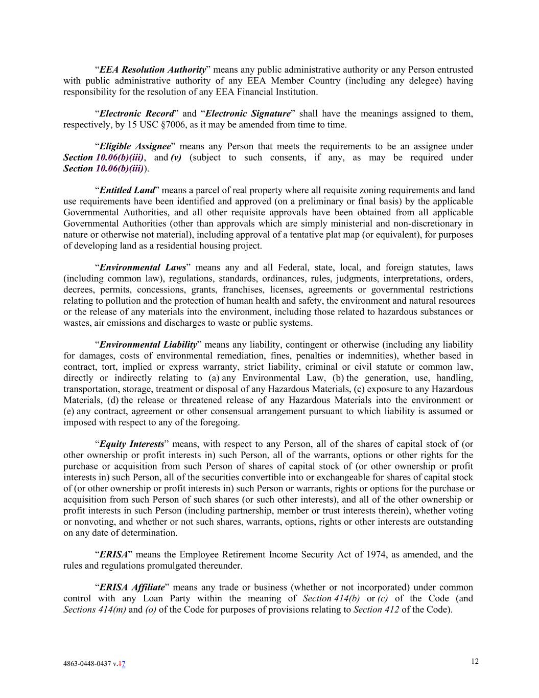 4863-0448-0437 v.17 12 “EEA Resolution Authority” means any public administrative authority or any Person entrusted with public administrative authority of any EEA Member Country (including any delegee) having responsibility for the resolution of any EEA Financial Institution. “Electronic Record” and “Electronic Signature” shall have the meanings assigned to them, respectively, by 15 USC §7006, as it may be amended from time to time. “Eligible Assignee” means any Person that meets the requirements to be an assignee under Section 10.06(b)(iii), and (v) (subject to such consents, if any, as may be required under Section 10.06(b)(iii)). “Entitled Land” means a parcel of real property where all requisite zoning requirements and land use requirements have been identified and approved (on a preliminary or final basis) by the applicable Governmental Authorities, and all other requisite approvals have been obtained from all applicable Governmental Authorities (other than approvals which are simply ministerial and non-discretionary in nature or otherwise not material), including approval of a tentative plat map (or equivalent), for purposes of developing land as a residential housing project. “Environmental Laws” means any and all Federal, state, local, and foreign statutes, laws (including common law), regulations, standards, ordinances, rules, judgments, interpretations, orders, decrees, permits, concessions, grants, franchises, licenses, agreements or governmental restrictions relating to pollution and the protection of human health and safety, the environment and natural resources or the release of any materials into the environment, including those related to hazardous substances or wastes, air emissions and discharges to waste or public systems. “Environmental Liability” means any liability, contingent or otherwise (including any liability for damages, costs of environmental remediation, fines, penalties or indemnities), whether based in contract, tort, implied or express warranty, strict liability, criminal or civil statute or common law, directly or indirectly relating to (a) any Environmental Law, (b) the generation, use, handling, transportation, storage, treatment or disposal of any Hazardous Materials, (c) exposure to any Hazardous Materials, (d) the release or threatened release of any Hazardous Materials into the environment or (e) any contract, agreement or other consensual arrangement pursuant to which liability is assumed or imposed with respect to any of the foregoing. “Equity Interests” means, with respect to any Person, all of the shares of capital stock of (or other ownership or profit interests in) such Person, all of the warrants, options or other rights for the purchase or acquisition from such Person of shares of capital stock of (or other ownership or profit interests in) such Person, all of the securities convertible into or exchangeable for shares of capital stock of (or other ownership or profit interests in) such Person or warrants, rights or options for the purchase or acquisition from such Person of such shares (or such other interests), and all of the other ownership or profit interests in such Person (including partnership, member or trust interests therein), whether voting or nonvoting, and whether or not such shares, warrants, options, rights or other interests are outstanding on any date of determination. “ERISA” means the Employee Retirement Income Security Act of 1974, as amended, and the rules and regulations promulgated thereunder. “ERISA Affiliate” means any trade or business (whether or not incorporated) under common control with any Loan Party within the meaning of Section 414(b) or (c) of the Code (and Sections 414(m) and (o) of the Code for purposes of provisions relating to Section 412 of the Code).