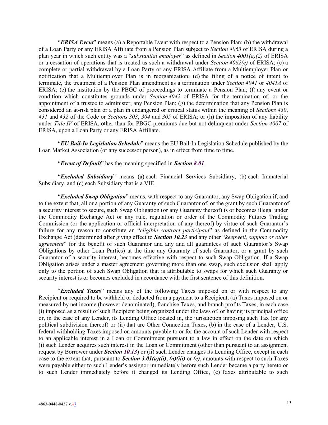 4863-0448-0437 v.17 13 “ERISA Event” means (a) a Reportable Event with respect to a Pension Plan; (b) the withdrawal of a Loan Party or any ERISA Affiliate from a Pension Plan subject to Section 4063 of ERISA during a plan year in which such entity was a “substantial employer” as defined in Section 4001(a)(2) of ERISA or a cessation of operations that is treated as such a withdrawal under Section 4062(e) of ERISA; (c) a complete or partial withdrawal by a Loan Party or any ERISA Affiliate from a Multiemployer Plan or notification that a Multiemployer Plan is in reorganization; (d) the filing of a notice of intent to terminate, the treatment of a Pension Plan amendment as a termination under Section 4041 or 4041A of ERISA; (e) the institution by the PBGC of proceedings to terminate a Pension Plan; (f) any event or condition which constitutes grounds under Section 4042 of ERISA for the termination of, or the appointment of a trustee to administer, any Pension Plan; (g) the determination that any Pension Plan is considered an at-risk plan or a plan in endangered or critical status within the meaning of Sections 430, 431 and 432 of the Code or Sections 303, 304 and 305 of ERISA; or (h) the imposition of any liability under Title IV of ERISA, other than for PBGC premiums due but not delinquent under Section 4007 of ERISA, upon a Loan Party or any ERISA Affiliate. “EU Bail-In Legislation Schedule” means the EU Bail-In Legislation Schedule published by the Loan Market Association (or any successor person), as in effect from time to time. “Event of Default” has the meaning specified in Section 8.01. “Excluded Subsidiary” means (a) each Financial Services Subsidiary, (b) each Immaterial Subsidiary, and (c) each Subsidiary that is a VIE. “Excluded Swap Obligation” means, with respect to any Guarantor, any Swap Obligation if, and to the extent that, all or a portion of any Guaranty of such Guarantor of, or the grant by such Guarantor of a security interest to secure, such Swap Obligation (or any Guaranty thereof) is or becomes illegal under the Commodity Exchange Act or any rule, regulation or order of the Commodity Futures Trading Commission (or the application or official interpretation of any thereof) by virtue of such Guarantor’s failure for any reason to constitute an “eligible contract participant” as defined in the Commodity Exchange Act (determined after giving effect to Section 10.23 and any other “keepwell, support or other agreement” for the benefit of such Guarantor and any and all guarantees of such Guarantor’s Swap Obligations by other Loan Parties) at the time any Guaranty of such Guarantor, or a grant by such Guarantor of a security interest, becomes effective with respect to such Swap Obligation. If a Swap Obligation arises under a master agreement governing more than one swap, such exclusion shall apply only to the portion of such Swap Obligation that is attributable to swaps for which such Guaranty or security interest is or becomes excluded in accordance with the first sentence of this definition. “Excluded Taxes” means any of the following Taxes imposed on or with respect to any Recipient or required to be withheld or deducted from a payment to a Recipient, (a) Taxes imposed on or measured by net income (however denominated), franchise Taxes, and branch profits Taxes, in each case, (i) imposed as a result of such Recipient being organized under the laws of, or having its principal office or, in the case of any Lender, its Lending Office located in, the jurisdiction imposing such Tax (or any political subdivision thereof) or (ii) that are Other Connection Taxes, (b) in the case of a Lender, U.S. federal withholding Taxes imposed on amounts payable to or for the account of such Lender with respect to an applicable interest in a Loan or Commitment pursuant to a law in effect on the date on which (i) such Lender acquires such interest in the Loan or Commitment (other than pursuant to an assignment request by Borrower under Section 10.13) or (ii) such Lender changes its Lending Office, except in each case to the extent that, pursuant to Section 3.01(a)(ii), (a)(iii) or (c), amounts with respect to such Taxes were payable either to such Lender’s assignor immediately before such Lender became a party hereto or to such Lender immediately before it changed its Lending Office, (c) Taxes attributable to such