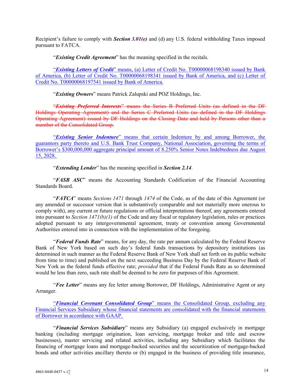 4863-0448-0437 v.17 14 Recipient’s failure to comply with Section 3.01(e) and (d) any U.S. federal withholding Taxes imposed pursuant to FATCA. “Existing Credit Agreement” has the meaning specified in the recitals. “Existing Letters of Credit” means, (a) Letter of Credit No. T00000068198340 issued by Bank of America, (b) Letter of Credit No. T00000068198341 issued by Bank of America, and (c) Letter of Credit No. T00000068197541 issued by Bank of America. “Existing Owners” means Patrick Zalupski and POZ Holdings, Inc. “Existing Preferred Interests” means the Series B Preferred Units (as defined in the DF Holdings Operating Agreement) and the Series C Preferred Units (as defined in the DF Holdings Operating Agreement) issued by DF Holdings on the Closing Date and held by Persons other than a member of the Consolidated Group. “Existing Senior Indenture” means that certain Indenture by and among Borrower, the guarantors party thereto and U.S. Bank Trust Company, National Association, governing the terms of Borrower’s $300,000,000 aggregate principal amount of 8.250% Senior Notes Indebtedness due August 15, 2028. “Extending Lender” has the meaning specified in Section 2.14. “FASB ASC” means the Accounting Standards Codification of the Financial Accounting Standards Board. “FATCA” means Sections 1471 through 1474 of the Code, as of the date of this Agreement (or any amended or successor version that is substantively comparable and not materially more onerous to comply with), any current or future regulations or official interpretations thereof, any agreements entered into pursuant to Section 1471(b)(1) of the Code and any fiscal or regulatory legislation, rules or practices adopted pursuant to any intergovernmental agreement, treaty or convention among Governmental Authorities entered into in connection with the implementation of the foregoing. “Federal Funds Rate” means, for any day, the rate per annum calculated by the Federal Reserve Bank of New York based on such day’s federal funds transactions by depository institutions (as determined in such manner as the Federal Reserve Bank of New York shall set forth on its public website from time to time) and published on the next succeeding Business Day by the Federal Reserve Bank of New York as the federal funds effective rate; provided that if the Federal Funds Rate as so determined would be less than zero, such rate shall be deemed to be zero for purposes of this Agreement. “Fee Letter” means any fee letter among Borrower, DF Holdings, Administrative Agent or any Arranger. “Financial Covenant Consolidated Group” means the Consolidated Group, excluding any Financial Services Subsidiary whose financial statements are consolidated with the financial statements of Borrower in accordance with GAAP. “Financial Services Subsidiary” means any Subsidiary (a) engaged exclusively in mortgage banking (including mortgage origination, loan servicing, mortgage broker and title and escrow businesses), master servicing and related activities, including any Subsidiary which facilitates the financing of mortgage loans and mortgage-backed securities and the securitization of mortgage-backed bonds and other activities ancillary thereto or (b) engaged in the business of providing title insurance,