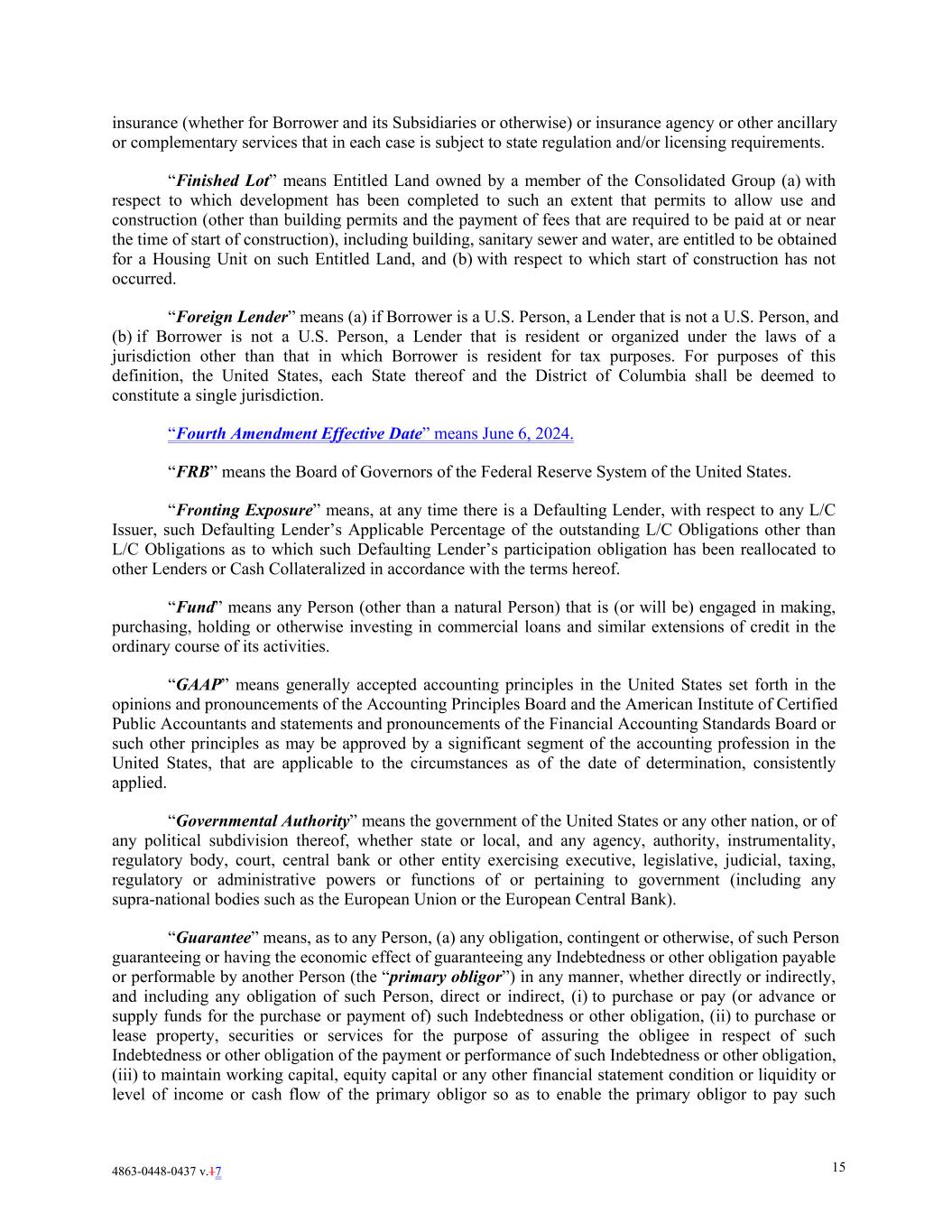 4863-0448-0437 v.17 15 insurance (whether for Borrower and its Subsidiaries or otherwise) or insurance agency or other ancillary or complementary services that in each case is subject to state regulation and/or licensing requirements. “Finished Lot” means Entitled Land owned by a member of the Consolidated Group (a) with respect to which development has been completed to such an extent that permits to allow use and construction (other than building permits and the payment of fees that are required to be paid at or near the time of start of construction), including building, sanitary sewer and water, are entitled to be obtained for a Housing Unit on such Entitled Land, and (b) with respect to which start of construction has not occurred. “Foreign Lender” means (a) if Borrower is a U.S. Person, a Lender that is not a U.S. Person, and (b) if Borrower is not a U.S. Person, a Lender that is resident or organized under the laws of a jurisdiction other than that in which Borrower is resident for tax purposes. For purposes of this definition, the United States, each State thereof and the District of Columbia shall be deemed to constitute a single jurisdiction. “Fourth Amendment Effective Date” means June 6, 2024. “FRB” means the Board of Governors of the Federal Reserve System of the United States. “Fronting Exposure” means, at any time there is a Defaulting Lender, with respect to any L/C Issuer, such Defaulting Lender’s Applicable Percentage of the outstanding L/C Obligations other than L/C Obligations as to which such Defaulting Lender’s participation obligation has been reallocated to other Lenders or Cash Collateralized in accordance with the terms hereof. “Fund” means any Person (other than a natural Person) that is (or will be) engaged in making, purchasing, holding or otherwise investing in commercial loans and similar extensions of credit in the ordinary course of its activities. “GAAP” means generally accepted accounting principles in the United States set forth in the opinions and pronouncements of the Accounting Principles Board and the American Institute of Certified Public Accountants and statements and pronouncements of the Financial Accounting Standards Board or such other principles as may be approved by a significant segment of the accounting profession in the United States, that are applicable to the circumstances as of the date of determination, consistently applied. “Governmental Authority” means the government of the United States or any other nation, or of any political subdivision thereof, whether state or local, and any agency, authority, instrumentality, regulatory body, court, central bank or other entity exercising executive, legislative, judicial, taxing, regulatory or administrative powers or functions of or pertaining to government (including any supra-national bodies such as the European Union or the European Central Bank). “Guarantee” means, as to any Person, (a) any obligation, contingent or otherwise, of such Person guaranteeing or having the economic effect of guaranteeing any Indebtedness or other obligation payable or performable by another Person (the “primary obligor”) in any manner, whether directly or indirectly, and including any obligation of such Person, direct or indirect, (i) to purchase or pay (or advance or supply funds for the purchase or payment of) such Indebtedness or other obligation, (ii) to purchase or lease property, securities or services for the purpose of assuring the obligee in respect of such Indebtedness or other obligation of the payment or performance of such Indebtedness or other obligation, (iii) to maintain working capital, equity capital or any other financial statement condition or liquidity or level of income or cash flow of the primary obligor so as to enable the primary obligor to pay such
