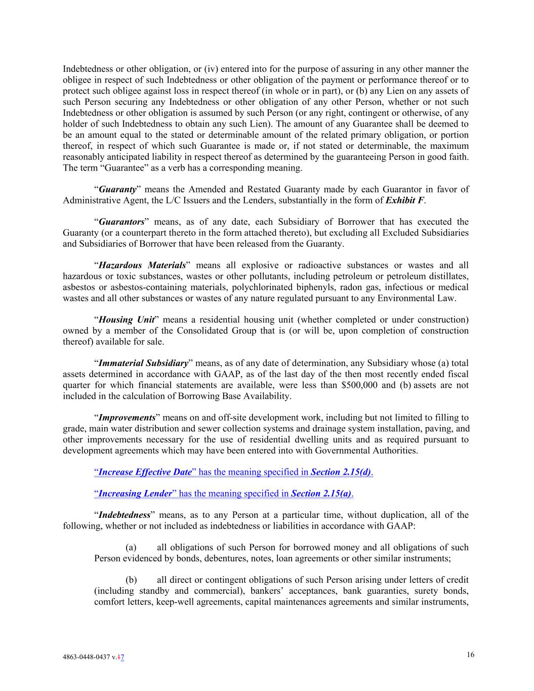 4863-0448-0437 v.17 16 Indebtedness or other obligation, or (iv) entered into for the purpose of assuring in any other manner the obligee in respect of such Indebtedness or other obligation of the payment or performance thereof or to protect such obligee against loss in respect thereof (in whole or in part), or (b) any Lien on any assets of such Person securing any Indebtedness or other obligation of any other Person, whether or not such Indebtedness or other obligation is assumed by such Person (or any right, contingent or otherwise, of any holder of such Indebtedness to obtain any such Lien). The amount of any Guarantee shall be deemed to be an amount equal to the stated or determinable amount of the related primary obligation, or portion thereof, in respect of which such Guarantee is made or, if not stated or determinable, the maximum reasonably anticipated liability in respect thereof as determined by the guaranteeing Person in good faith. The term “Guarantee” as a verb has a corresponding meaning. “Guaranty” means the Amended and Restated Guaranty made by each Guarantor in favor of Administrative Agent, the L/C Issuers and the Lenders, substantially in the form of Exhibit F. “Guarantors” means, as of any date, each Subsidiary of Borrower that has executed the Guaranty (or a counterpart thereto in the form attached thereto), but excluding all Excluded Subsidiaries and Subsidiaries of Borrower that have been released from the Guaranty. “Hazardous Materials” means all explosive or radioactive substances or wastes and all hazardous or toxic substances, wastes or other pollutants, including petroleum or petroleum distillates, asbestos or asbestos-containing materials, polychlorinated biphenyls, radon gas, infectious or medical wastes and all other substances or wastes of any nature regulated pursuant to any Environmental Law. “Housing Unit” means a residential housing unit (whether completed or under construction) owned by a member of the Consolidated Group that is (or will be, upon completion of construction thereof) available for sale. “Immaterial Subsidiary” means, as of any date of determination, any Subsidiary whose (a) total assets determined in accordance with GAAP, as of the last day of the then most recently ended fiscal quarter for which financial statements are available, were less than $500,000 and (b) assets are not included in the calculation of Borrowing Base Availability. “Improvements” means on and off-site development work, including but not limited to filling to grade, main water distribution and sewer collection systems and drainage system installation, paving, and other improvements necessary for the use of residential dwelling units and as required pursuant to development agreements which may have been entered into with Governmental Authorities. “Increase Effective Date” has the meaning specified in Section 2.15(d). “Increasing Lender” has the meaning specified in Section 2.15(a). “Indebtedness” means, as to any Person at a particular time, without duplication, all of the following, whether or not included as indebtedness or liabilities in accordance with GAAP: (a) all obligations of such Person for borrowed money and all obligations of such Person evidenced by bonds, debentures, notes, loan agreements or other similar instruments; (b) all direct or contingent obligations of such Person arising under letters of credit (including standby and commercial), bankers’ acceptances, bank guaranties, surety bonds, comfort letters, keep-well agreements, capital maintenances agreements and similar instruments,