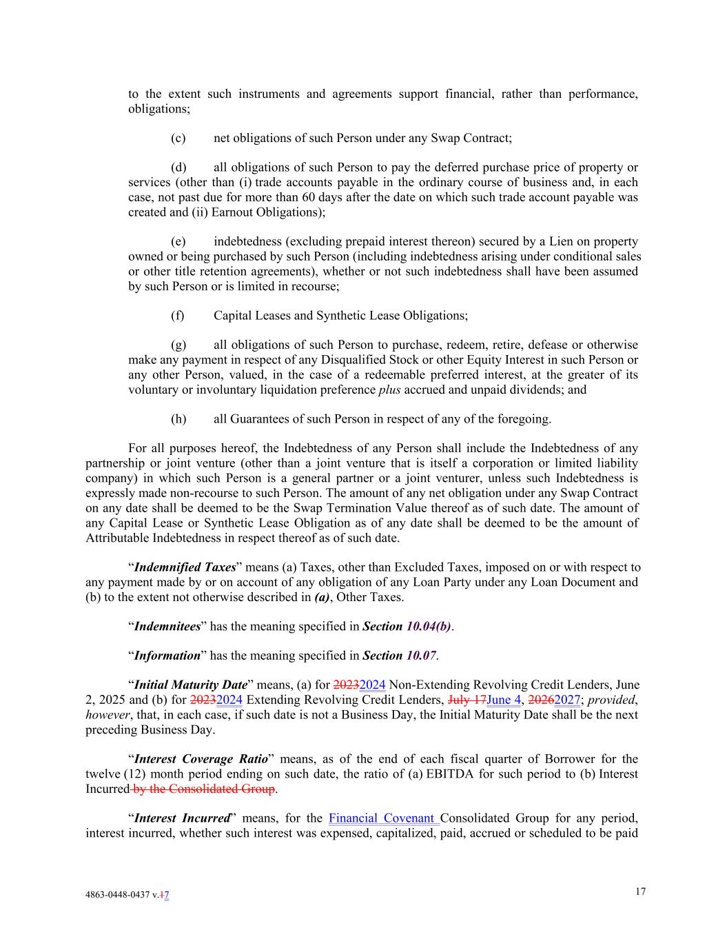 4863-0448-0437 v.17 17 to the extent such instruments and agreements support financial, rather than performance, obligations; (c) net obligations of such Person under any Swap Contract; (d) all obligations of such Person to pay the deferred purchase price of property or services (other than (i) trade accounts payable in the ordinary course of business and, in each case, not past due for more than 60 days after the date on which such trade account payable was created and (ii) Earnout Obligations); (e) indebtedness (excluding prepaid interest thereon) secured by a Lien on property owned or being purchased by such Person (including indebtedness arising under conditional sales or other title retention agreements), whether or not such indebtedness shall have been assumed by such Person or is limited in recourse; (f) Capital Leases and Synthetic Lease Obligations; (g) all obligations of such Person to purchase, redeem, retire, defease or otherwise make any payment in respect of any Disqualified Stock or other Equity Interest in such Person or any other Person, valued, in the case of a redeemable preferred interest, at the greater of its voluntary or involuntary liquidation preference plus accrued and unpaid dividends; and (h) all Guarantees of such Person in respect of any of the foregoing. For all purposes hereof, the Indebtedness of any Person shall include the Indebtedness of any partnership or joint venture (other than a joint venture that is itself a corporation or limited liability company) in which such Person is a general partner or a joint venturer, unless such Indebtedness is expressly made non-recourse to such Person. The amount of any net obligation under any Swap Contract on any date shall be deemed to be the Swap Termination Value thereof as of such date. The amount of any Capital Lease or Synthetic Lease Obligation as of any date shall be deemed to be the amount of Attributable Indebtedness in respect thereof as of such date. “Indemnified Taxes” means (a) Taxes, other than Excluded Taxes, imposed on or with respect to any payment made by or on account of any obligation of any Loan Party under any Loan Document and (b) to the extent not otherwise described in (a), Other Taxes. “Indemnitees” has the meaning specified in Section 10.04(b). “Information” has the meaning specified in Section 10.07. “Initial Maturity Date” means, (a) for 20232024 Non-Extending Revolving Credit Lenders, June 2, 2025 and (b) for 20232024 Extending Revolving Credit Lenders, July 17June 4, 20262027; provided, however, that, in each case, if such date is not a Business Day, the Initial Maturity Date shall be the next preceding Business Day. “Interest Coverage Ratio” means, as of the end of each fiscal quarter of Borrower for the twelve (12) month period ending on such date, the ratio of (a) EBITDA for such period to (b) Interest Incurred by the Consolidated Group. “Interest Incurred” means, for the Financial Covenant Consolidated Group for any period, interest incurred, whether such interest was expensed, capitalized, paid, accrued or scheduled to be paid