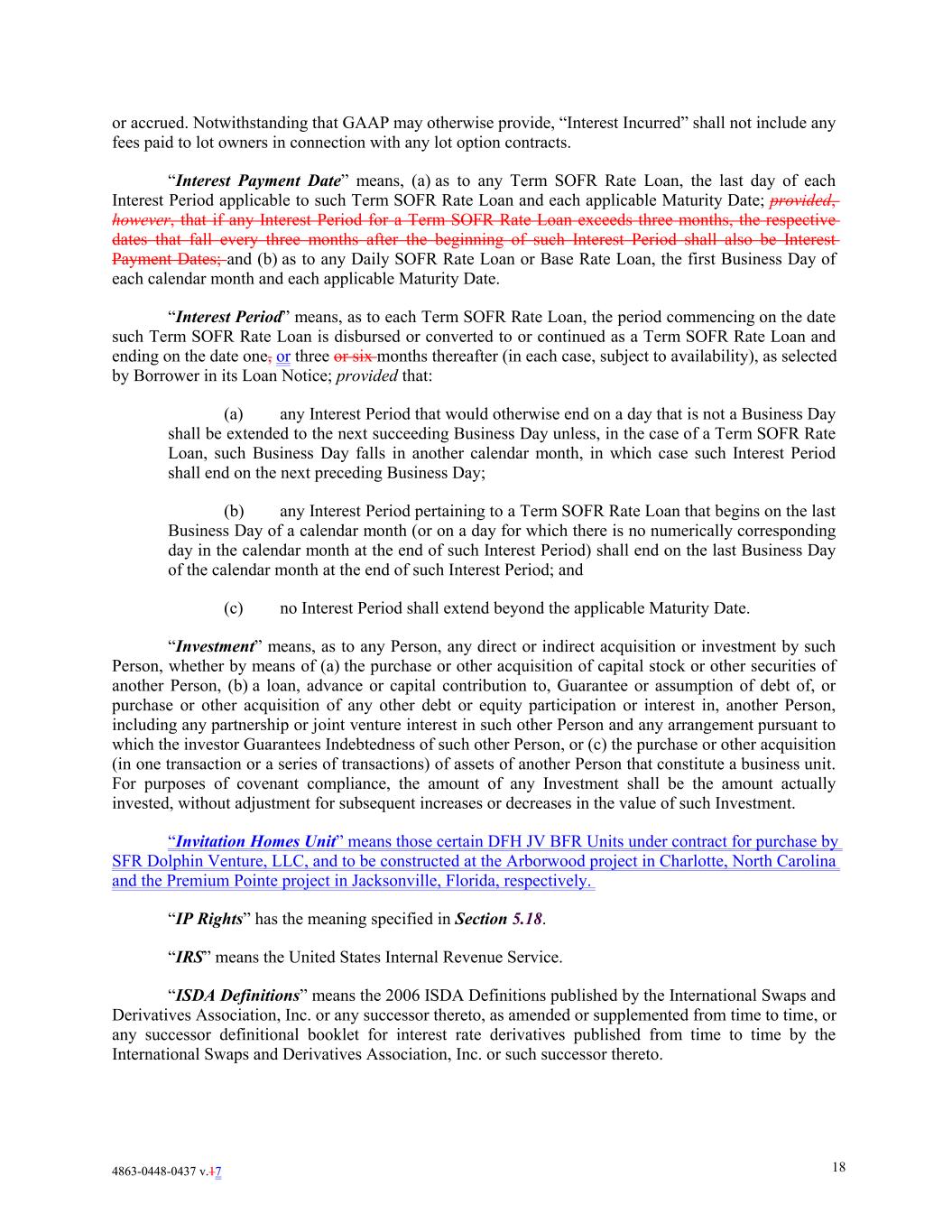 4863-0448-0437 v.17 18 or accrued. Notwithstanding that GAAP may otherwise provide, “Interest Incurred” shall not include any fees paid to lot owners in connection with any lot option contracts. “Interest Payment Date” means, (a) as to any Term SOFR Rate Loan, the last day of each Interest Period applicable to such Term SOFR Rate Loan and each applicable Maturity Date; provided, however, that if any Interest Period for a Term SOFR Rate Loan exceeds three months, the respective dates that fall every three months after the beginning of such Interest Period shall also be Interest Payment Dates; and (b) as to any Daily SOFR Rate Loan or Base Rate Loan, the first Business Day of each calendar month and each applicable Maturity Date. “Interest Period” means, as to each Term SOFR Rate Loan, the period commencing on the date such Term SOFR Rate Loan is disbursed or converted to or continued as a Term SOFR Rate Loan and ending on the date one, or three or six months thereafter (in each case, subject to availability), as selected by Borrower in its Loan Notice; provided that: (a) any Interest Period that would otherwise end on a day that is not a Business Day shall be extended to the next succeeding Business Day unless, in the case of a Term SOFR Rate Loan, such Business Day falls in another calendar month, in which case such Interest Period shall end on the next preceding Business Day; (b) any Interest Period pertaining to a Term SOFR Rate Loan that begins on the last Business Day of a calendar month (or on a day for which there is no numerically corresponding day in the calendar month at the end of such Interest Period) shall end on the last Business Day of the calendar month at the end of such Interest Period; and (c) no Interest Period shall extend beyond the applicable Maturity Date. “Investment” means, as to any Person, any direct or indirect acquisition or investment by such Person, whether by means of (a) the purchase or other acquisition of capital stock or other securities of another Person, (b) a loan, advance or capital contribution to, Guarantee or assumption of debt of, or purchase or other acquisition of any other debt or equity participation or interest in, another Person, including any partnership or joint venture interest in such other Person and any arrangement pursuant to which the investor Guarantees Indebtedness of such other Person, or (c) the purchase or other acquisition (in one transaction or a series of transactions) of assets of another Person that constitute a business unit. For purposes of covenant compliance, the amount of any Investment shall be the amount actually invested, without adjustment for subsequent increases or decreases in the value of such Investment. “Invitation Homes Unit” means those certain DFH JV BFR Units under contract for purchase by SFR Dolphin Venture, LLC, and to be constructed at the Arborwood project in Charlotte, North Carolina and the Premium Pointe project in Jacksonville, Florida, respectively. “IP Rights” has the meaning specified in Section 5.18. “IRS” means the United States Internal Revenue Service. “ISDA Definitions” means the 2006 ISDA Definitions published by the International Swaps and Derivatives Association, Inc. or any successor thereto, as amended or supplemented from time to time, or any successor definitional booklet for interest rate derivatives published from time to time by the International Swaps and Derivatives Association, Inc. or such successor thereto.