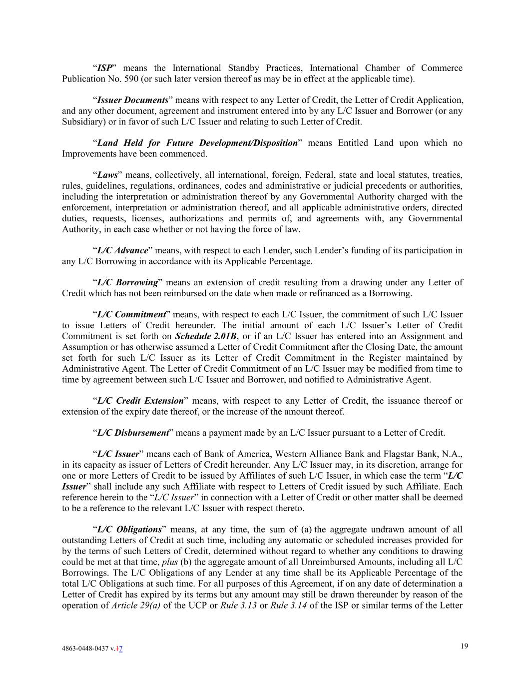 4863-0448-0437 v.17 19 “ISP” means the International Standby Practices, International Chamber of Commerce Publication No. 590 (or such later version thereof as may be in effect at the applicable time). “Issuer Documents” means with respect to any Letter of Credit, the Letter of Credit Application, and any other document, agreement and instrument entered into by any L/C Issuer and Borrower (or any Subsidiary) or in favor of such L/C Issuer and relating to such Letter of Credit. “Land Held for Future Development/Disposition” means Entitled Land upon which no Improvements have been commenced. “Laws” means, collectively, all international, foreign, Federal, state and local statutes, treaties, rules, guidelines, regulations, ordinances, codes and administrative or judicial precedents or authorities, including the interpretation or administration thereof by any Governmental Authority charged with the enforcement, interpretation or administration thereof, and all applicable administrative orders, directed duties, requests, licenses, authorizations and permits of, and agreements with, any Governmental Authority, in each case whether or not having the force of law. “L/C Advance” means, with respect to each Lender, such Lender’s funding of its participation in any L/C Borrowing in accordance with its Applicable Percentage. “L/C Borrowing” means an extension of credit resulting from a drawing under any Letter of Credit which has not been reimbursed on the date when made or refinanced as a Borrowing. “L/C Commitment” means, with respect to each L/C Issuer, the commitment of such L/C Issuer to issue Letters of Credit hereunder. The initial amount of each L/C Issuer’s Letter of Credit Commitment is set forth on Schedule 2.01B, or if an L/C Issuer has entered into an Assignment and Assumption or has otherwise assumed a Letter of Credit Commitment after the Closing Date, the amount set forth for such L/C Issuer as its Letter of Credit Commitment in the Register maintained by Administrative Agent. The Letter of Credit Commitment of an L/C Issuer may be modified from time to time by agreement between such L/C Issuer and Borrower, and notified to Administrative Agent. “L/C Credit Extension” means, with respect to any Letter of Credit, the issuance thereof or extension of the expiry date thereof, or the increase of the amount thereof. “L/C Disbursement” means a payment made by an L/C Issuer pursuant to a Letter of Credit. “L/C Issuer” means each of Bank of America, Western Alliance Bank and Flagstar Bank, N.A., in its capacity as issuer of Letters of Credit hereunder. Any L/C Issuer may, in its discretion, arrange for one or more Letters of Credit to be issued by Affiliates of such L/C Issuer, in which case the term “L/C Issuer” shall include any such Affiliate with respect to Letters of Credit issued by such Affiliate. Each reference herein to the “L/C Issuer” in connection with a Letter of Credit or other matter shall be deemed to be a reference to the relevant L/C Issuer with respect thereto. “L/C Obligations” means, at any time, the sum of (a) the aggregate undrawn amount of all outstanding Letters of Credit at such time, including any automatic or scheduled increases provided for by the terms of such Letters of Credit, determined without regard to whether any conditions to drawing could be met at that time, plus (b) the aggregate amount of all Unreimbursed Amounts, including all L/C Borrowings. The L/C Obligations of any Lender at any time shall be its Applicable Percentage of the total L/C Obligations at such time. For all purposes of this Agreement, if on any date of determination a Letter of Credit has expired by its terms but any amount may still be drawn thereunder by reason of the operation of Article 29(a) of the UCP or Rule 3.13 or Rule 3.14 of the ISP or similar terms of the Letter