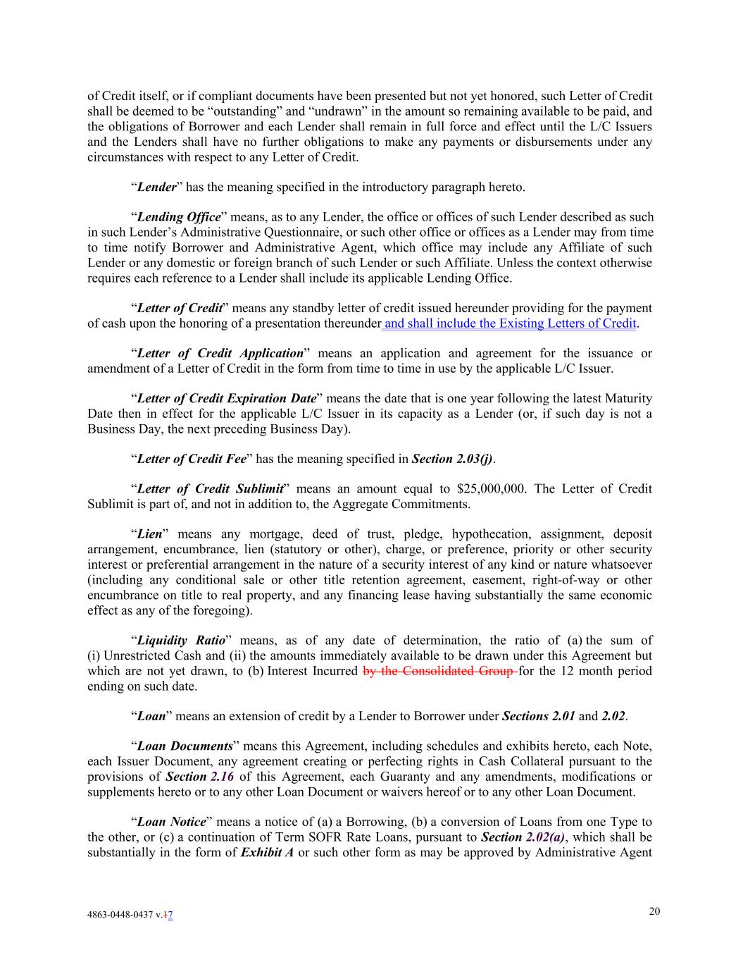 4863-0448-0437 v.17 20 of Credit itself, or if compliant documents have been presented but not yet honored, such Letter of Credit shall be deemed to be “outstanding” and “undrawn” in the amount so remaining available to be paid, and the obligations of Borrower and each Lender shall remain in full force and effect until the L/C Issuers and the Lenders shall have no further obligations to make any payments or disbursements under any circumstances with respect to any Letter of Credit. “Lender” has the meaning specified in the introductory paragraph hereto. “Lending Office” means, as to any Lender, the office or offices of such Lender described as such in such Lender’s Administrative Questionnaire, or such other office or offices as a Lender may from time to time notify Borrower and Administrative Agent, which office may include any Affiliate of such Lender or any domestic or foreign branch of such Lender or such Affiliate. Unless the context otherwise requires each reference to a Lender shall include its applicable Lending Office. “Letter of Credit” means any standby letter of credit issued hereunder providing for the payment of cash upon the honoring of a presentation thereunder and shall include the Existing Letters of Credit. “Letter of Credit Application” means an application and agreement for the issuance or amendment of a Letter of Credit in the form from time to time in use by the applicable L/C Issuer. “Letter of Credit Expiration Date” means the date that is one year following the latest Maturity Date then in effect for the applicable L/C Issuer in its capacity as a Lender (or, if such day is not a Business Day, the next preceding Business Day). “Letter of Credit Fee” has the meaning specified in Section 2.03(j). “Letter of Credit Sublimit” means an amount equal to $25,000,000. The Letter of Credit Sublimit is part of, and not in addition to, the Aggregate Commitments. “Lien” means any mortgage, deed of trust, pledge, hypothecation, assignment, deposit arrangement, encumbrance, lien (statutory or other), charge, or preference, priority or other security interest or preferential arrangement in the nature of a security interest of any kind or nature whatsoever (including any conditional sale or other title retention agreement, easement, right-of-way or other encumbrance on title to real property, and any financing lease having substantially the same economic effect as any of the foregoing). “Liquidity Ratio” means, as of any date of determination, the ratio of (a) the sum of (i) Unrestricted Cash and (ii) the amounts immediately available to be drawn under this Agreement but which are not yet drawn, to (b) Interest Incurred by the Consolidated Group for the 12 month period ending on such date. “Loan” means an extension of credit by a Lender to Borrower under Sections 2.01 and 2.02. “Loan Documents” means this Agreement, including schedules and exhibits hereto, each Note, each Issuer Document, any agreement creating or perfecting rights in Cash Collateral pursuant to the provisions of Section 2.16 of this Agreement, each Guaranty and any amendments, modifications or supplements hereto or to any other Loan Document or waivers hereof or to any other Loan Document. “Loan Notice” means a notice of (a) a Borrowing, (b) a conversion of Loans from one Type to the other, or (c) a continuation of Term SOFR Rate Loans, pursuant to Section 2.02(a), which shall be substantially in the form of Exhibit A or such other form as may be approved by Administrative Agent