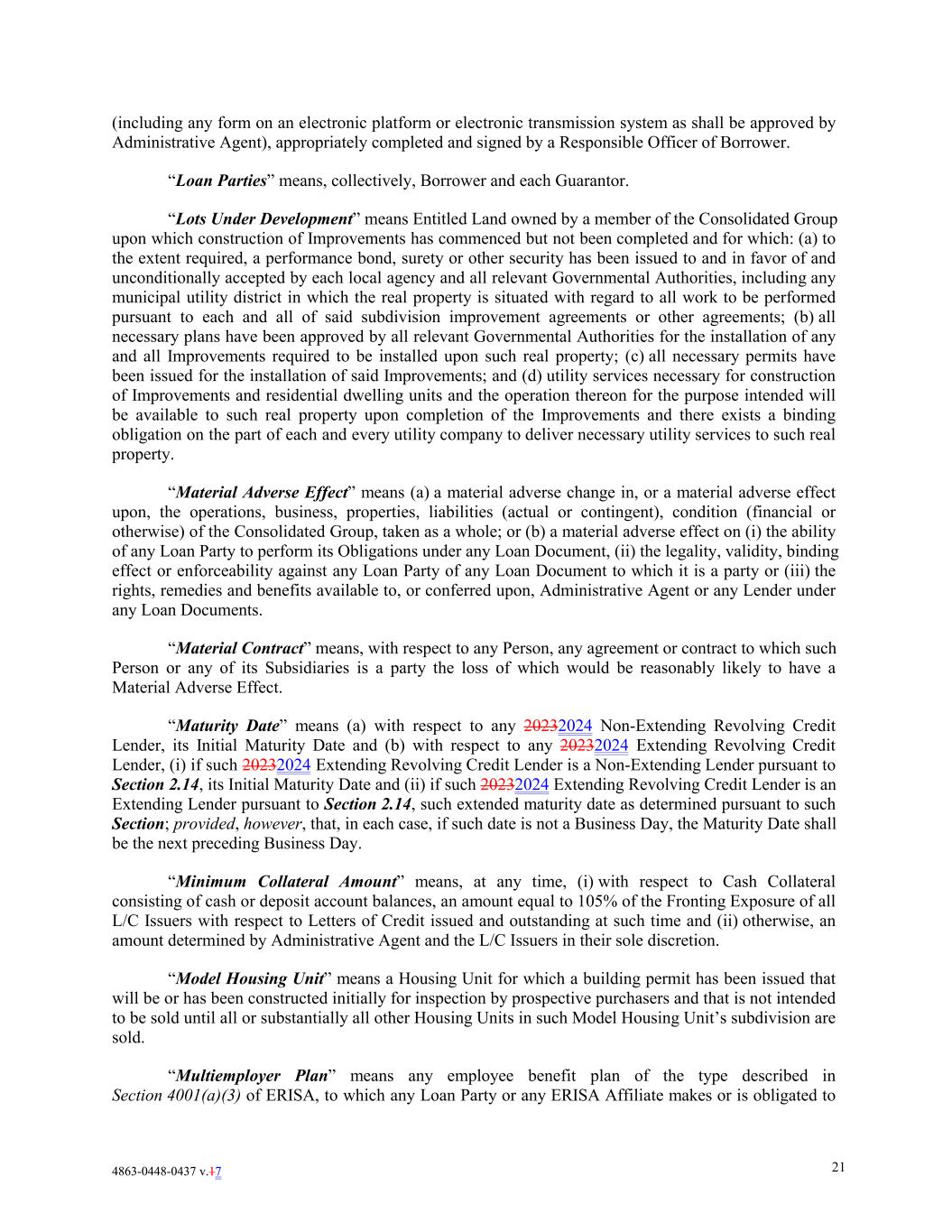 4863-0448-0437 v.17 21 (including any form on an electronic platform or electronic transmission system as shall be approved by Administrative Agent), appropriately completed and signed by a Responsible Officer of Borrower. “Loan Parties” means, collectively, Borrower and each Guarantor. “Lots Under Development” means Entitled Land owned by a member of the Consolidated Group upon which construction of Improvements has commenced but not been completed and for which: (a) to the extent required, a performance bond, surety or other security has been issued to and in favor of and unconditionally accepted by each local agency and all relevant Governmental Authorities, including any municipal utility district in which the real property is situated with regard to all work to be performed pursuant to each and all of said subdivision improvement agreements or other agreements; (b) all necessary plans have been approved by all relevant Governmental Authorities for the installation of any and all Improvements required to be installed upon such real property; (c) all necessary permits have been issued for the installation of said Improvements; and (d) utility services necessary for construction of Improvements and residential dwelling units and the operation thereon for the purpose intended will be available to such real property upon completion of the Improvements and there exists a binding obligation on the part of each and every utility company to deliver necessary utility services to such real property. “Material Adverse Effect” means (a) a material adverse change in, or a material adverse effect upon, the operations, business, properties, liabilities (actual or contingent), condition (financial or otherwise) of the Consolidated Group, taken as a whole; or (b) a material adverse effect on (i) the ability of any Loan Party to perform its Obligations under any Loan Document, (ii) the legality, validity, binding effect or enforceability against any Loan Party of any Loan Document to which it is a party or (iii) the rights, remedies and benefits available to, or conferred upon, Administrative Agent or any Lender under any Loan Documents. “Material Contract” means, with respect to any Person, any agreement or contract to which such Person or any of its Subsidiaries is a party the loss of which would be reasonably likely to have a Material Adverse Effect. “Maturity Date” means (a) with respect to any 20232024 Non-Extending Revolving Credit Lender, its Initial Maturity Date and (b) with respect to any 20232024 Extending Revolving Credit Lender, (i) if such 20232024 Extending Revolving Credit Lender is a Non-Extending Lender pursuant to Section 2.14, its Initial Maturity Date and (ii) if such 20232024 Extending Revolving Credit Lender is an Extending Lender pursuant to Section 2.14, such extended maturity date as determined pursuant to such Section; provided, however, that, in each case, if such date is not a Business Day, the Maturity Date shall be the next preceding Business Day. “Minimum Collateral Amount” means, at any time, (i) with respect to Cash Collateral consisting of cash or deposit account balances, an amount equal to 105% of the Fronting Exposure of all L/C Issuers with respect to Letters of Credit issued and outstanding at such time and (ii) otherwise, an amount determined by Administrative Agent and the L/C Issuers in their sole discretion. “Model Housing Unit” means a Housing Unit for which a building permit has been issued that will be or has been constructed initially for inspection by prospective purchasers and that is not intended to be sold until all or substantially all other Housing Units in such Model Housing Unit’s subdivision are sold. “Multiemployer Plan” means any employee benefit plan of the type described in Section 4001(a)(3) of ERISA, to which any Loan Party or any ERISA Affiliate makes or is obligated to