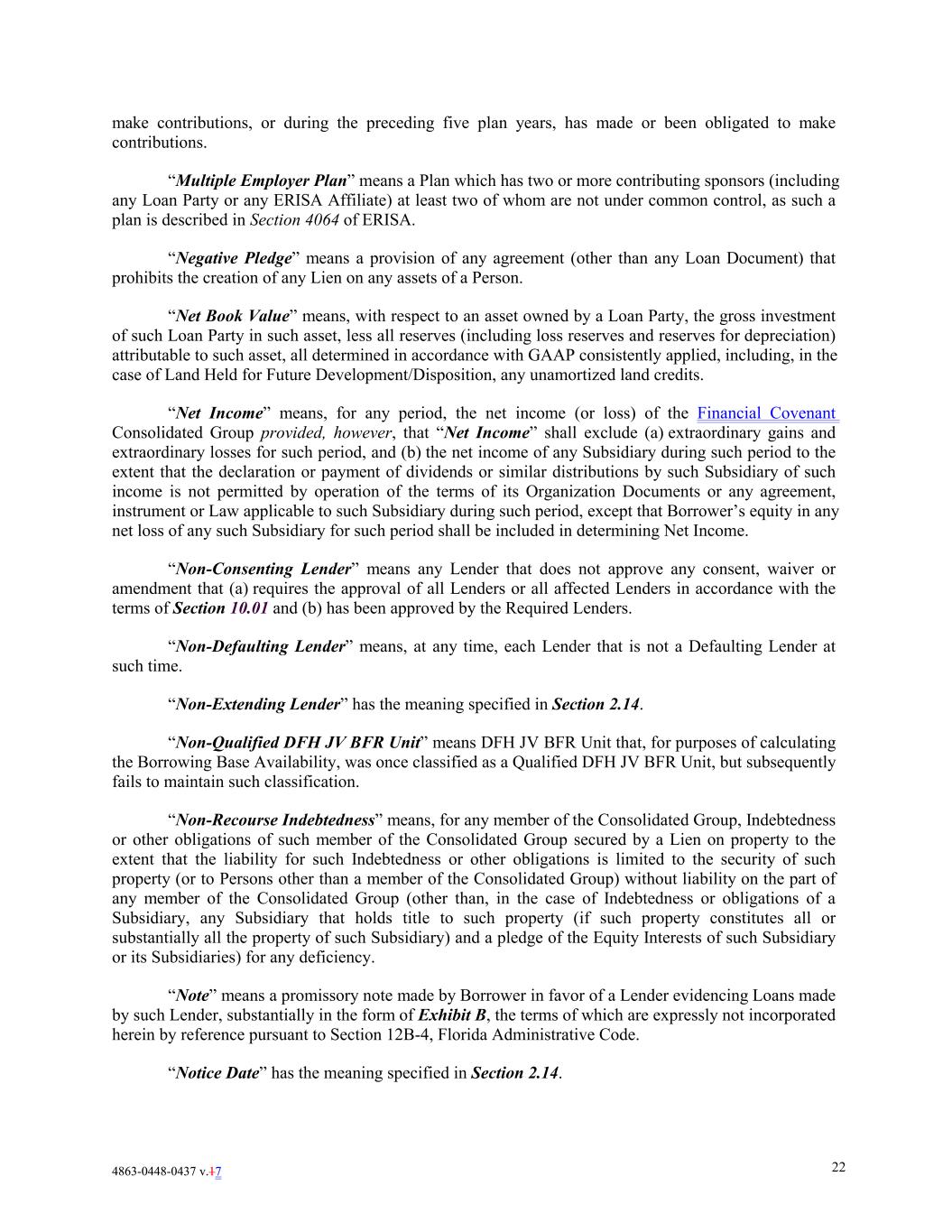 4863-0448-0437 v.17 22 make contributions, or during the preceding five plan years, has made or been obligated to make contributions. “Multiple Employer Plan” means a Plan which has two or more contributing sponsors (including any Loan Party or any ERISA Affiliate) at least two of whom are not under common control, as such a plan is described in Section 4064 of ERISA. “Negative Pledge” means a provision of any agreement (other than any Loan Document) that prohibits the creation of any Lien on any assets of a Person. “Net Book Value” means, with respect to an asset owned by a Loan Party, the gross investment of such Loan Party in such asset, less all reserves (including loss reserves and reserves for depreciation) attributable to such asset, all determined in accordance with GAAP consistently applied, including, in the case of Land Held for Future Development/Disposition, any unamortized land credits. “Net Income” means, for any period, the net income (or loss) of the Financial Covenant Consolidated Group provided, however, that “Net Income” shall exclude (a) extraordinary gains and extraordinary losses for such period, and (b) the net income of any Subsidiary during such period to the extent that the declaration or payment of dividends or similar distributions by such Subsidiary of such income is not permitted by operation of the terms of its Organization Documents or any agreement, instrument or Law applicable to such Subsidiary during such period, except that Borrower’s equity in any net loss of any such Subsidiary for such period shall be included in determining Net Income. “Non-Consenting Lender” means any Lender that does not approve any consent, waiver or amendment that (a) requires the approval of all Lenders or all affected Lenders in accordance with the terms of Section 10.01 and (b) has been approved by the Required Lenders. “Non-Defaulting Lender” means, at any time, each Lender that is not a Defaulting Lender at such time. “Non-Extending Lender” has the meaning specified in Section 2.14. “Non-Qualified DFH JV BFR Unit” means DFH JV BFR Unit that, for purposes of calculating the Borrowing Base Availability, was once classified as a Qualified DFH JV BFR Unit, but subsequently fails to maintain such classification. “Non-Recourse Indebtedness” means, for any member of the Consolidated Group, Indebtedness or other obligations of such member of the Consolidated Group secured by a Lien on property to the extent that the liability for such Indebtedness or other obligations is limited to the security of such property (or to Persons other than a member of the Consolidated Group) without liability on the part of any member of the Consolidated Group (other than, in the case of Indebtedness or obligations of a Subsidiary, any Subsidiary that holds title to such property (if such property constitutes all or substantially all the property of such Subsidiary) and a pledge of the Equity Interests of such Subsidiary or its Subsidiaries) for any deficiency. “Note” means a promissory note made by Borrower in favor of a Lender evidencing Loans made by such Lender, substantially in the form of Exhibit B, the terms of which are expressly not incorporated herein by reference pursuant to Section 12B-4, Florida Administrative Code. “Notice Date” has the meaning specified in Section 2.14.