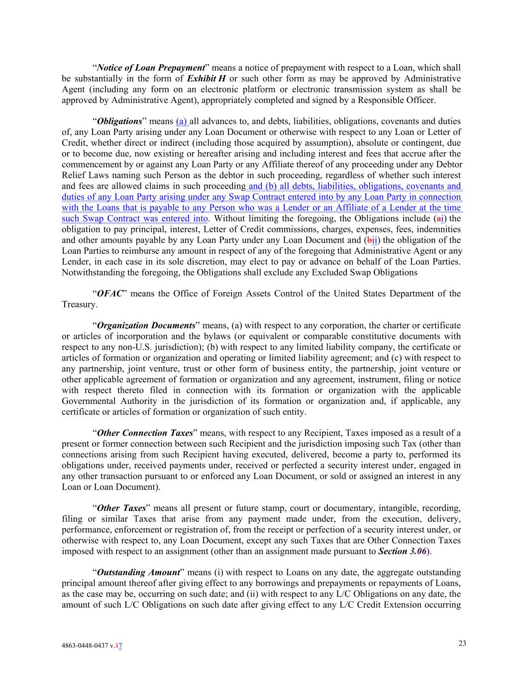4863-0448-0437 v.17 23 “Notice of Loan Prepayment” means a notice of prepayment with respect to a Loan, which shall be substantially in the form of Exhibit H or such other form as may be approved by Administrative Agent (including any form on an electronic platform or electronic transmission system as shall be approved by Administrative Agent), appropriately completed and signed by a Responsible Officer. “Obligations” means (a) all advances to, and debts, liabilities, obligations, covenants and duties of, any Loan Party arising under any Loan Document or otherwise with respect to any Loan or Letter of Credit, whether direct or indirect (including those acquired by assumption), absolute or contingent, due or to become due, now existing or hereafter arising and including interest and fees that accrue after the commencement by or against any Loan Party or any Affiliate thereof of any proceeding under any Debtor Relief Laws naming such Person as the debtor in such proceeding, regardless of whether such interest and fees are allowed claims in such proceeding and (b) all debts, liabilities, obligations, covenants and duties of any Loan Party arising under any Swap Contract entered into by any Loan Party in connection with the Loans that is payable to any Person who was a Lender or an Affiliate of a Lender at the time such Swap Contract was entered into. Without limiting the foregoing, the Obligations include (ai) the obligation to pay principal, interest, Letter of Credit commissions, charges, expenses, fees, indemnities and other amounts payable by any Loan Party under any Loan Document and (bii) the obligation of the Loan Parties to reimburse any amount in respect of any of the foregoing that Administrative Agent or any Lender, in each case in its sole discretion, may elect to pay or advance on behalf of the Loan Parties. Notwithstanding the foregoing, the Obligations shall exclude any Excluded Swap Obligations “OFAC” means the Office of Foreign Assets Control of the United States Department of the Treasury. “Organization Documents” means, (a) with respect to any corporation, the charter or certificate or articles of incorporation and the bylaws (or equivalent or comparable constitutive documents with respect to any non-U.S. jurisdiction); (b) with respect to any limited liability company, the certificate or articles of formation or organization and operating or limited liability agreement; and (c) with respect to any partnership, joint venture, trust or other form of business entity, the partnership, joint venture or other applicable agreement of formation or organization and any agreement, instrument, filing or notice with respect thereto filed in connection with its formation or organization with the applicable Governmental Authority in the jurisdiction of its formation or organization and, if applicable, any certificate or articles of formation or organization of such entity. “Other Connection Taxes” means, with respect to any Recipient, Taxes imposed as a result of a present or former connection between such Recipient and the jurisdiction imposing such Tax (other than connections arising from such Recipient having executed, delivered, become a party to, performed its obligations under, received payments under, received or perfected a security interest under, engaged in any other transaction pursuant to or enforced any Loan Document, or sold or assigned an interest in any Loan or Loan Document). “Other Taxes” means all present or future stamp, court or documentary, intangible, recording, filing or similar Taxes that arise from any payment made under, from the execution, delivery, performance, enforcement or registration of, from the receipt or perfection of a security interest under, or otherwise with respect to, any Loan Document, except any such Taxes that are Other Connection Taxes imposed with respect to an assignment (other than an assignment made pursuant to Section 3.06). “Outstanding Amount” means (i) with respect to Loans on any date, the aggregate outstanding principal amount thereof after giving effect to any borrowings and prepayments or repayments of Loans, as the case may be, occurring on such date; and (ii) with respect to any L/C Obligations on any date, the amount of such L/C Obligations on such date after giving effect to any L/C Credit Extension occurring