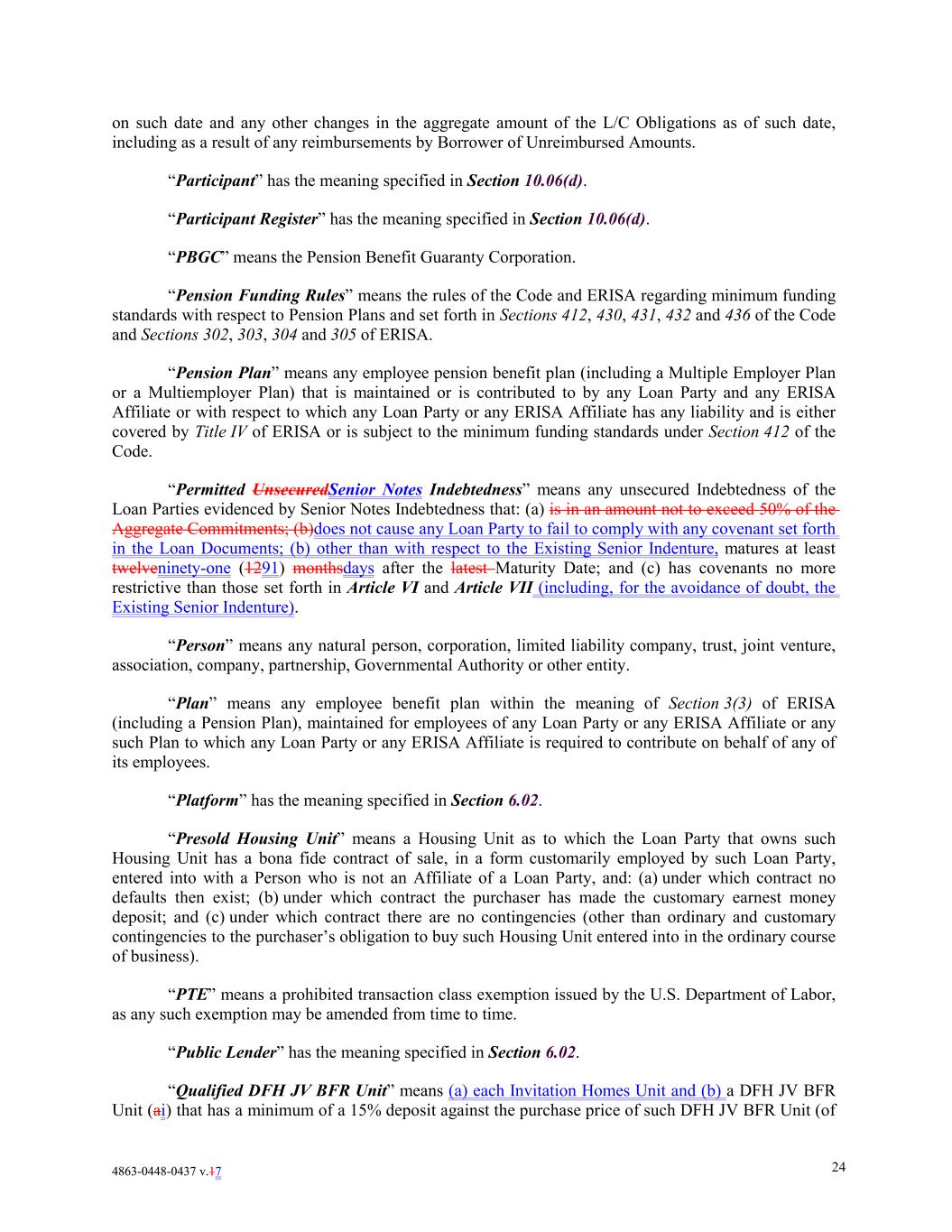 4863-0448-0437 v.17 24 on such date and any other changes in the aggregate amount of the L/C Obligations as of such date, including as a result of any reimbursements by Borrower of Unreimbursed Amounts. “Participant” has the meaning specified in Section 10.06(d). “Participant Register” has the meaning specified in Section 10.06(d). “PBGC” means the Pension Benefit Guaranty Corporation. “Pension Funding Rules” means the rules of the Code and ERISA regarding minimum funding standards with respect to Pension Plans and set forth in Sections 412, 430, 431, 432 and 436 of the Code and Sections 302, 303, 304 and 305 of ERISA. “Pension Plan” means any employee pension benefit plan (including a Multiple Employer Plan or a Multiemployer Plan) that is maintained or is contributed to by any Loan Party and any ERISA Affiliate or with respect to which any Loan Party or any ERISA Affiliate has any liability and is either covered by Title IV of ERISA or is subject to the minimum funding standards under Section 412 of the Code. “Permitted UnsecuredSenior Notes Indebtedness” means any unsecured Indebtedness of the Loan Parties evidenced by Senior Notes Indebtedness that: (a) is in an amount not to exceed 50% of the Aggregate Commitments; (b)does not cause any Loan Party to fail to comply with any covenant set forth in the Loan Documents; (b) other than with respect to the Existing Senior Indenture, matures at least twelveninety-one (1291) monthsdays after the latest Maturity Date; and (c) has covenants no more restrictive than those set forth in Article VI and Article VII (including, for the avoidance of doubt, the Existing Senior Indenture). “Person” means any natural person, corporation, limited liability company, trust, joint venture, association, company, partnership, Governmental Authority or other entity. “Plan” means any employee benefit plan within the meaning of Section 3(3) of ERISA (including a Pension Plan), maintained for employees of any Loan Party or any ERISA Affiliate or any such Plan to which any Loan Party or any ERISA Affiliate is required to contribute on behalf of any of its employees. “Platform” has the meaning specified in Section 6.02. “Presold Housing Unit” means a Housing Unit as to which the Loan Party that owns such Housing Unit has a bona fide contract of sale, in a form customarily employed by such Loan Party, entered into with a Person who is not an Affiliate of a Loan Party, and: (a) under which contract no defaults then exist; (b) under which contract the purchaser has made the customary earnest money deposit; and (c) under which contract there are no contingencies (other than ordinary and customary contingencies to the purchaser’s obligation to buy such Housing Unit entered into in the ordinary course of business). “PTE” means a prohibited transaction class exemption issued by the U.S. Department of Labor, as any such exemption may be amended from time to time. “Public Lender” has the meaning specified in Section 6.02. “Qualified DFH JV BFR Unit” means (a) each Invitation Homes Unit and (b) a DFH JV BFR Unit (ai) that has a minimum of a 15% deposit against the purchase price of such DFH JV BFR Unit (of