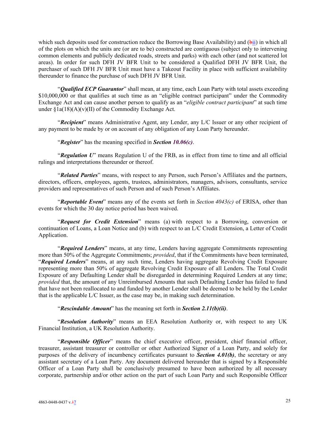 4863-0448-0437 v.17 25 which such deposits used for construction reduce the Borrowing Base Availability) and (bii) in which all of the plots on which the units are (or are to be) constructed are contiguous (subject only to intervening common elements and publicly dedicated roads, streets and parks) with each other (and not scattered lot areas). In order for such DFH JV BFR Unit to be considered a Qualified DFH JV BFR Unit, the purchaser of such DFH JV BFR Unit must have a Takeout Facility in place with sufficient availability thereunder to finance the purchase of such DFH JV BFR Unit. “Qualified ECP Guarantor” shall mean, at any time, each Loan Party with total assets exceeding $10,000,000 or that qualifies at such time as an “eligible contract participant” under the Commodity Exchange Act and can cause another person to qualify as an “eligible contract participant” at such time under §1a(18)(A)(v)(II) of the Commodity Exchange Act. “Recipient” means Administrative Agent, any Lender, any L/C Issuer or any other recipient of any payment to be made by or on account of any obligation of any Loan Party hereunder. “Register” has the meaning specified in Section 10.06(c). “Regulation U” means Regulation U of the FRB, as in effect from time to time and all official rulings and interpretations thereunder or thereof. “Related Parties” means, with respect to any Person, such Person’s Affiliates and the partners, directors, officers, employees, agents, trustees, administrators, managers, advisors, consultants, service providers and representatives of such Person and of such Person’s Affiliates. “Reportable Event” means any of the events set forth in Section 4043(c) of ERISA, other than events for which the 30 day notice period has been waived. “Request for Credit Extension” means (a) with respect to a Borrowing, conversion or continuation of Loans, a Loan Notice and (b) with respect to an L/C Credit Extension, a Letter of Credit Application. “Required Lenders” means, at any time, Lenders having aggregate Commitments representing more than 50% of the Aggregate Commitments; provided, that if the Commitments have been terminated, “Required Lenders” means, at any such time, Lenders having aggregate Revolving Credit Exposure representing more than 50% of aggregate Revolving Credit Exposure of all Lenders. The Total Credit Exposure of any Defaulting Lender shall be disregarded in determining Required Lenders at any time; provided that, the amount of any Unreimbursed Amounts that such Defaulting Lender has failed to fund that have not been reallocated to and funded by another Lender shall be deemed to be held by the Lender that is the applicable L/C Issuer, as the case may be, in making such determination. “Rescindable Amount” has the meaning set forth in Section 2.11(b)(ii). “Resolution Authority” means an EEA Resolution Authority or, with respect to any UK Financial Institution, a UK Resolution Authority. “Responsible Officer” means the chief executive officer, president, chief financial officer, treasurer, assistant treasurer or controller or other Authorized Signer of a Loan Party, and solely for purposes of the delivery of incumbency certificates pursuant to Section 4.01(b), the secretary or any assistant secretary of a Loan Party. Any document delivered hereunder that is signed by a Responsible Officer of a Loan Party shall be conclusively presumed to have been authorized by all necessary corporate, partnership and/or other action on the part of such Loan Party and such Responsible Officer