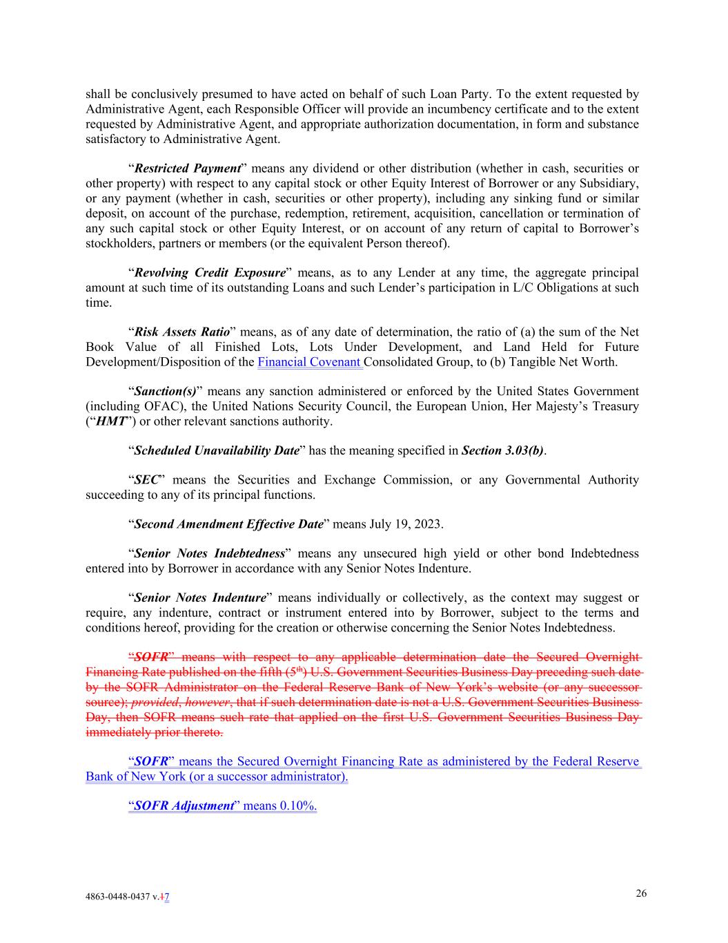 4863-0448-0437 v.17 26 shall be conclusively presumed to have acted on behalf of such Loan Party. To the extent requested by Administrative Agent, each Responsible Officer will provide an incumbency certificate and to the extent requested by Administrative Agent, and appropriate authorization documentation, in form and substance satisfactory to Administrative Agent. “Restricted Payment” means any dividend or other distribution (whether in cash, securities or other property) with respect to any capital stock or other Equity Interest of Borrower or any Subsidiary, or any payment (whether in cash, securities or other property), including any sinking fund or similar deposit, on account of the purchase, redemption, retirement, acquisition, cancellation or termination of any such capital stock or other Equity Interest, or on account of any return of capital to Borrower’s stockholders, partners or members (or the equivalent Person thereof). “Revolving Credit Exposure” means, as to any Lender at any time, the aggregate principal amount at such time of its outstanding Loans and such Lender’s participation in L/C Obligations at such time. “Risk Assets Ratio” means, as of any date of determination, the ratio of (a) the sum of the Net Book Value of all Finished Lots, Lots Under Development, and Land Held for Future Development/Disposition of the Financial Covenant Consolidated Group, to (b) Tangible Net Worth. “Sanction(s)” means any sanction administered or enforced by the United States Government (including OFAC), the United Nations Security Council, the European Union, Her Majesty’s Treasury (“HMT”) or other relevant sanctions authority. “Scheduled Unavailability Date” has the meaning specified in Section 3.03(b). “SEC” means the Securities and Exchange Commission, or any Governmental Authority succeeding to any of its principal functions. “Second Amendment Effective Date” means July 19, 2023. “Senior Notes Indebtedness” means any unsecured high yield or other bond Indebtedness entered into by Borrower in accordance with any Senior Notes Indenture. “Senior Notes Indenture” means individually or collectively, as the context may suggest or require, any indenture, contract or instrument entered into by Borrower, subject to the terms and conditions hereof, providing for the creation or otherwise concerning the Senior Notes Indebtedness. “SOFR” means with respect to any applicable determination date the Secured Overnight Financing Rate published on the fifth (5th) U.S. Government Securities Business Day preceding such date by the SOFR Administrator on the Federal Reserve Bank of New York’s website (or any successor source); provided, however, that if such determination date is not a U.S. Government Securities Business Day, then SOFR means such rate that applied on the first U.S. Government Securities Business Day immediately prior thereto. “SOFR” means the Secured Overnight Financing Rate as administered by the Federal Reserve Bank of New York (or a successor administrator). “SOFR Adjustment” means 0.10%.