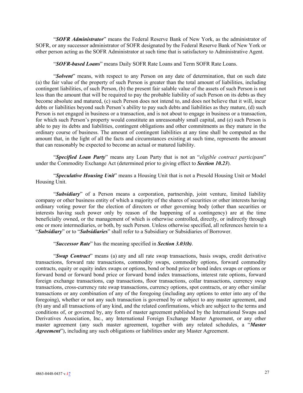 4863-0448-0437 v.17 27 “SOFR Administrator” means the Federal Reserve Bank of New York, as the administrator of SOFR, or any successor administrator of SOFR designated by the Federal Reserve Bank of New York or other person acting as the SOFR Administrator at such time that is satisfactory to Administrative Agent. “SOFR-based Loans” means Daily SOFR Rate Loans and Term SOFR Rate Loans. “Solvent” means, with respect to any Person on any date of determination, that on such date (a) the fair value of the property of such Person is greater than the total amount of liabilities, including contingent liabilities, of such Person, (b) the present fair salable value of the assets of such Person is not less than the amount that will be required to pay the probable liability of such Person on its debts as they become absolute and matured, (c) such Person does not intend to, and does not believe that it will, incur debts or liabilities beyond such Person’s ability to pay such debts and liabilities as they mature, (d) such Person is not engaged in business or a transaction, and is not about to engage in business or a transaction, for which such Person’s property would constitute an unreasonably small capital, and (e) such Person is able to pay its debts and liabilities, contingent obligations and other commitments as they mature in the ordinary course of business. The amount of contingent liabilities at any time shall be computed as the amount that, in the light of all the facts and circumstances existing at such time, represents the amount that can reasonably be expected to become an actual or matured liability. “Specified Loan Party” means any Loan Party that is not an “eligible contract participant” under the Commodity Exchange Act (determined prior to giving effect to Section 10.23). “Speculative Housing Unit” means a Housing Unit that is not a Presold Housing Unit or Model Housing Unit. “Subsidiary” of a Person means a corporation, partnership, joint venture, limited liability company or other business entity of which a majority of the shares of securities or other interests having ordinary voting power for the election of directors or other governing body (other than securities or interests having such power only by reason of the happening of a contingency) are at the time beneficially owned, or the management of which is otherwise controlled, directly, or indirectly through one or more intermediaries, or both, by such Person. Unless otherwise specified, all references herein to a “Subsidiary” or to “Subsidiaries” shall refer to a Subsidiary or Subsidiaries of Borrower. “Successor Rate” has the meaning specified in Section 3.03(b). “Swap Contract” means (a) any and all rate swap transactions, basis swaps, credit derivative transactions, forward rate transactions, commodity swaps, commodity options, forward commodity contracts, equity or equity index swaps or options, bond or bond price or bond index swaps or options or forward bond or forward bond price or forward bond index transactions, interest rate options, forward foreign exchange transactions, cap transactions, floor transactions, collar transactions, currency swap transactions, cross-currency rate swap transactions, currency options, spot contracts, or any other similar transactions or any combination of any of the foregoing (including any options to enter into any of the foregoing), whether or not any such transaction is governed by or subject to any master agreement, and (b) any and all transactions of any kind, and the related confirmations, which are subject to the terms and conditions of, or governed by, any form of master agreement published by the International Swaps and Derivatives Association, Inc., any International Foreign Exchange Master Agreement, or any other master agreement (any such master agreement, together with any related schedules, a “Master Agreement”), including any such obligations or liabilities under any Master Agreement.