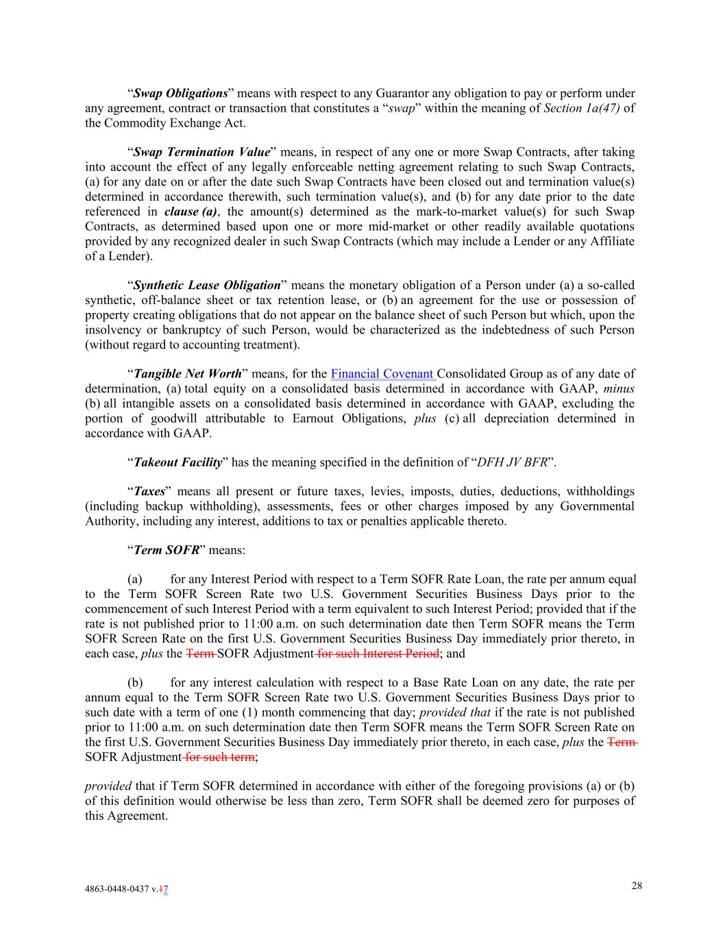 4863-0448-0437 v.17 28 “Swap Obligations” means with respect to any Guarantor any obligation to pay or perform under any agreement, contract or transaction that constitutes a “swap” within the meaning of Section 1a(47) of the Commodity Exchange Act. “Swap Termination Value” means, in respect of any one or more Swap Contracts, after taking into account the effect of any legally enforceable netting agreement relating to such Swap Contracts, (a) for any date on or after the date such Swap Contracts have been closed out and termination value(s) determined in accordance therewith, such termination value(s), and (b) for any date prior to the date referenced in clause (a), the amount(s) determined as the mark-to-market value(s) for such Swap Contracts, as determined based upon one or more mid-market or other readily available quotations provided by any recognized dealer in such Swap Contracts (which may include a Lender or any Affiliate of a Lender). “Synthetic Lease Obligation” means the monetary obligation of a Person under (a) a so-called synthetic, off-balance sheet or tax retention lease, or (b) an agreement for the use or possession of property creating obligations that do not appear on the balance sheet of such Person but which, upon the insolvency or bankruptcy of such Person, would be characterized as the indebtedness of such Person (without regard to accounting treatment). “Tangible Net Worth” means, for the Financial Covenant Consolidated Group as of any date of determination, (a) total equity on a consolidated basis determined in accordance with GAAP, minus (b) all intangible assets on a consolidated basis determined in accordance with GAAP, excluding the portion of goodwill attributable to Earnout Obligations, plus (c) all depreciation determined in accordance with GAAP. “Takeout Facility” has the meaning specified in the definition of “DFH JV BFR”. “Taxes” means all present or future taxes, levies, imposts, duties, deductions, withholdings (including backup withholding), assessments, fees or other charges imposed by any Governmental Authority, including any interest, additions to tax or penalties applicable thereto. “Term SOFR” means: (a) for any Interest Period with respect to a Term SOFR Rate Loan, the rate per annum equal to the Term SOFR Screen Rate two U.S. Government Securities Business Days prior to the commencement of such Interest Period with a term equivalent to such Interest Period; provided that if the rate is not published prior to 11:00 a.m. on such determination date then Term SOFR means the Term SOFR Screen Rate on the first U.S. Government Securities Business Day immediately prior thereto, in each case, plus the Term SOFR Adjustment for such Interest Period; and (b) for any interest calculation with respect to a Base Rate Loan on any date, the rate per annum equal to the Term SOFR Screen Rate two U.S. Government Securities Business Days prior to such date with a term of one (1) month commencing that day; provided that if the rate is not published prior to 11:00 a.m. on such determination date then Term SOFR means the Term SOFR Screen Rate on the first U.S. Government Securities Business Day immediately prior thereto, in each case, plus the Term SOFR Adjustment for such term; provided that if Term SOFR determined in accordance with either of the foregoing provisions (a) or (b) of this definition would otherwise be less than zero, Term SOFR shall be deemed zero for purposes of this Agreement.