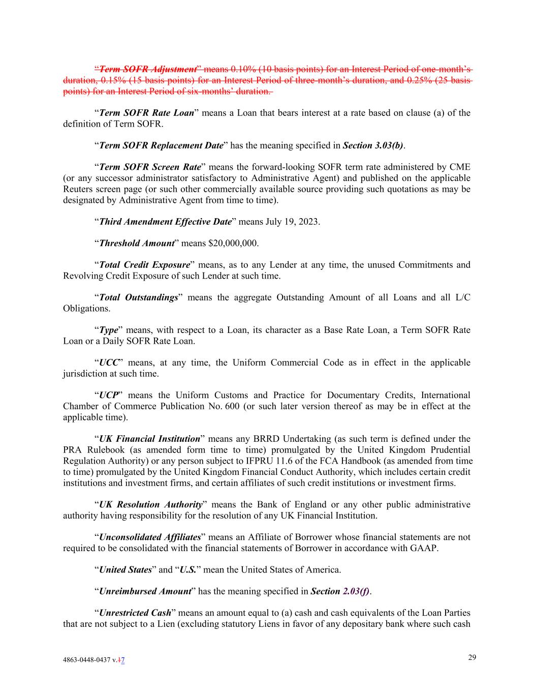 4863-0448-0437 v.17 29 “Term SOFR Adjustment” means 0.10% (10 basis points) for an Interest Period of one-month’s duration, 0.15% (15 basis points) for an Interest Period of three-month’s duration, and 0.25% (25 basis points) for an Interest Period of six-months’ duration. “Term SOFR Rate Loan” means a Loan that bears interest at a rate based on clause (a) of the definition of Term SOFR. “Term SOFR Replacement Date” has the meaning specified in Section 3.03(b). “Term SOFR Screen Rate” means the forward-looking SOFR term rate administered by CME (or any successor administrator satisfactory to Administrative Agent) and published on the applicable Reuters screen page (or such other commercially available source providing such quotations as may be designated by Administrative Agent from time to time). “Third Amendment Effective Date” means July 19, 2023. “Threshold Amount” means $20,000,000. “Total Credit Exposure” means, as to any Lender at any time, the unused Commitments and Revolving Credit Exposure of such Lender at such time. “Total Outstandings” means the aggregate Outstanding Amount of all Loans and all L/C Obligations. “Type” means, with respect to a Loan, its character as a Base Rate Loan, a Term SOFR Rate Loan or a Daily SOFR Rate Loan. “UCC” means, at any time, the Uniform Commercial Code as in effect in the applicable jurisdiction at such time. “UCP” means the Uniform Customs and Practice for Documentary Credits, International Chamber of Commerce Publication No. 600 (or such later version thereof as may be in effect at the applicable time). “UK Financial Institution” means any BRRD Undertaking (as such term is defined under the PRA Rulebook (as amended form time to time) promulgated by the United Kingdom Prudential Regulation Authority) or any person subject to IFPRU 11.6 of the FCA Handbook (as amended from time to time) promulgated by the United Kingdom Financial Conduct Authority, which includes certain credit institutions and investment firms, and certain affiliates of such credit institutions or investment firms. “UK Resolution Authority” means the Bank of England or any other public administrative authority having responsibility for the resolution of any UK Financial Institution. “Unconsolidated Affiliates” means an Affiliate of Borrower whose financial statements are not required to be consolidated with the financial statements of Borrower in accordance with GAAP. “United States” and “U.S.” mean the United States of America. “Unreimbursed Amount” has the meaning specified in Section 2.03(f). “Unrestricted Cash” means an amount equal to (a) cash and cash equivalents of the Loan Parties that are not subject to a Lien (excluding statutory Liens in favor of any depositary bank where such cash