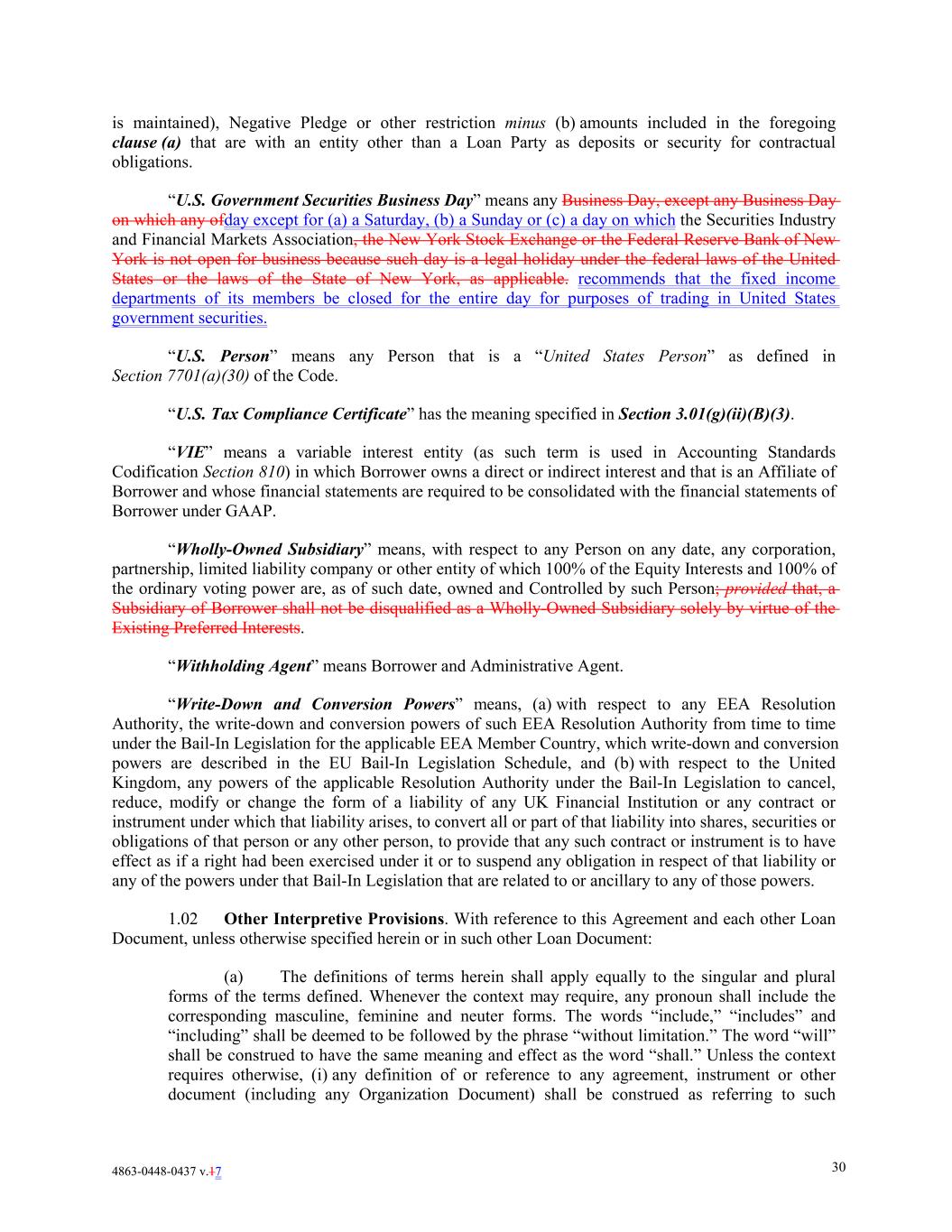 4863-0448-0437 v.17 30 is maintained), Negative Pledge or other restriction minus (b) amounts included in the foregoing clause (a) that are with an entity other than a Loan Party as deposits or security for contractual obligations. “U.S. Government Securities Business Day” means any Business Day, except any Business Day on which any ofday except for (a) a Saturday, (b) a Sunday or (c) a day on which the Securities Industry and Financial Markets Association, the New York Stock Exchange or the Federal Reserve Bank of New York is not open for business because such day is a legal holiday under the federal laws of the United States or the laws of the State of New York, as applicable. recommends that the fixed income departments of its members be closed for the entire day for purposes of trading in United States government securities. “U.S. Person” means any Person that is a “United States Person” as defined in Section 7701(a)(30) of the Code. “U.S. Tax Compliance Certificate” has the meaning specified in Section 3.01(g)(ii)(B)(3). “VIE” means a variable interest entity (as such term is used in Accounting Standards Codification Section 810) in which Borrower owns a direct or indirect interest and that is an Affiliate of Borrower and whose financial statements are required to be consolidated with the financial statements of Borrower under GAAP. “Wholly-Owned Subsidiary” means, with respect to any Person on any date, any corporation, partnership, limited liability company or other entity of which 100% of the Equity Interests and 100% of the ordinary voting power are, as of such date, owned and Controlled by such Person; provided that, a Subsidiary of Borrower shall not be disqualified as a Wholly-Owned Subsidiary solely by virtue of the Existing Preferred Interests. “Withholding Agent” means Borrower and Administrative Agent. “Write-Down and Conversion Powers” means, (a) with respect to any EEA Resolution Authority, the write-down and conversion powers of such EEA Resolution Authority from time to time under the Bail-In Legislation for the applicable EEA Member Country, which write-down and conversion powers are described in the EU Bail-In Legislation Schedule, and (b) with respect to the United Kingdom, any powers of the applicable Resolution Authority under the Bail-In Legislation to cancel, reduce, modify or change the form of a liability of any UK Financial Institution or any contract or instrument under which that liability arises, to convert all or part of that liability into shares, securities or obligations of that person or any other person, to provide that any such contract or instrument is to have effect as if a right had been exercised under it or to suspend any obligation in respect of that liability or any of the powers under that Bail-In Legislation that are related to or ancillary to any of those powers. 1.02 Other Interpretive Provisions. With reference to this Agreement and each other Loan Document, unless otherwise specified herein or in such other Loan Document: (a) The definitions of terms herein shall apply equally to the singular and plural forms of the terms defined. Whenever the context may require, any pronoun shall include the corresponding masculine, feminine and neuter forms. The words “include,” “includes” and “including” shall be deemed to be followed by the phrase “without limitation.” The word “will” shall be construed to have the same meaning and effect as the word “shall.” Unless the context requires otherwise, (i) any definition of or reference to any agreement, instrument or other document (including any Organization Document) shall be construed as referring to such