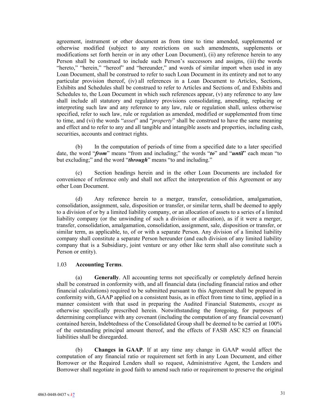 4863-0448-0437 v.17 31 agreement, instrument or other document as from time to time amended, supplemented or otherwise modified (subject to any restrictions on such amendments, supplements or modifications set forth herein or in any other Loan Document), (ii) any reference herein to any Person shall be construed to include such Person’s successors and assigns, (iii) the words “hereto,” “herein,” “hereof” and “hereunder,” and words of similar import when used in any Loan Document, shall be construed to refer to such Loan Document in its entirety and not to any particular provision thereof, (iv) all references in a Loan Document to Articles, Sections, Exhibits and Schedules shall be construed to refer to Articles and Sections of, and Exhibits and Schedules to, the Loan Document in which such references appear, (v) any reference to any law shall include all statutory and regulatory provisions consolidating, amending, replacing or interpreting such law and any reference to any law, rule or regulation shall, unless otherwise specified, refer to such law, rule or regulation as amended, modified or supplemented from time to time, and (vi) the words “asset” and “property” shall be construed to have the same meaning and effect and to refer to any and all tangible and intangible assets and properties, including cash, securities, accounts and contract rights. (b) In the computation of periods of time from a specified date to a later specified date, the word “from” means “from and including;” the words “to” and “until” each mean “to but excluding;” and the word “through” means “to and including.” (c) Section headings herein and in the other Loan Documents are included for convenience of reference only and shall not affect the interpretation of this Agreement or any other Loan Document. (d) Any reference herein to a merger, transfer, consolidation, amalgamation, consolidation, assignment, sale, disposition or transfer, or similar term, shall be deemed to apply to a division of or by a limited liability company, or an allocation of assets to a series of a limited liability company (or the unwinding of such a division or allocation), as if it were a merger, transfer, consolidation, amalgamation, consolidation, assignment, sale, disposition or transfer, or similar term, as applicable, to, of or with a separate Person. Any division of a limited liability company shall constitute a separate Person hereunder (and each division of any limited liability company that is a Subsidiary, joint venture or any other like term shall also constitute such a Person or entity). 1.03 Accounting Terms. (a) Generally. All accounting terms not specifically or completely defined herein shall be construed in conformity with, and all financial data (including financial ratios and other financial calculations) required to be submitted pursuant to this Agreement shall be prepared in conformity with, GAAP applied on a consistent basis, as in effect from time to time, applied in a manner consistent with that used in preparing the Audited Financial Statements, except as otherwise specifically prescribed herein. Notwithstanding the foregoing, for purposes of determining compliance with any covenant (including the computation of any financial covenant) contained herein, Indebtedness of the Consolidated Group shall be deemed to be carried at 100% of the outstanding principal amount thereof, and the effects of FASB ASC 825 on financial liabilities shall be disregarded. (b) Changes in GAAP. If at any time any change in GAAP would affect the computation of any financial ratio or requirement set forth in any Loan Document, and either Borrower or the Required Lenders shall so request, Administrative Agent, the Lenders and Borrower shall negotiate in good faith to amend such ratio or requirement to preserve the original
